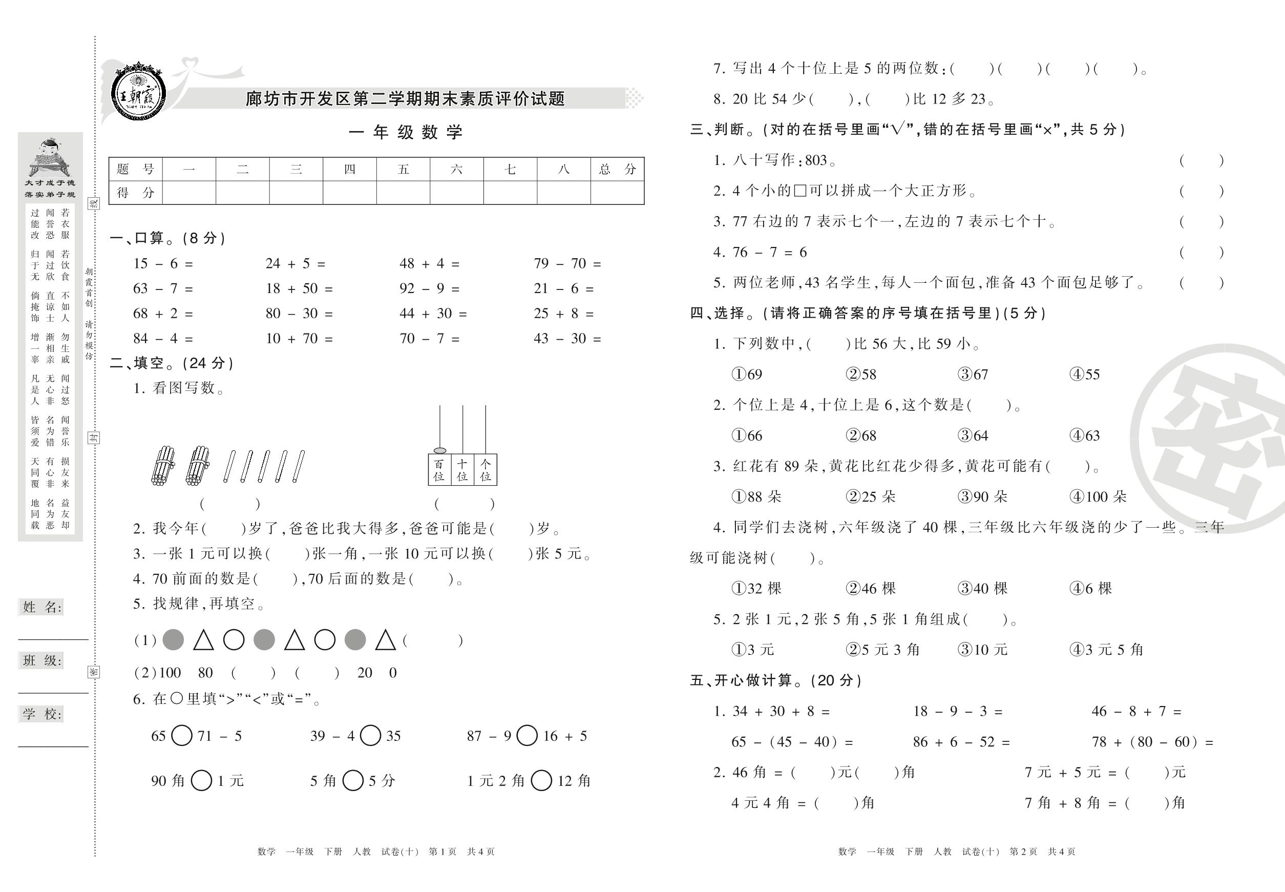 一年级数学人教版下册期末卷