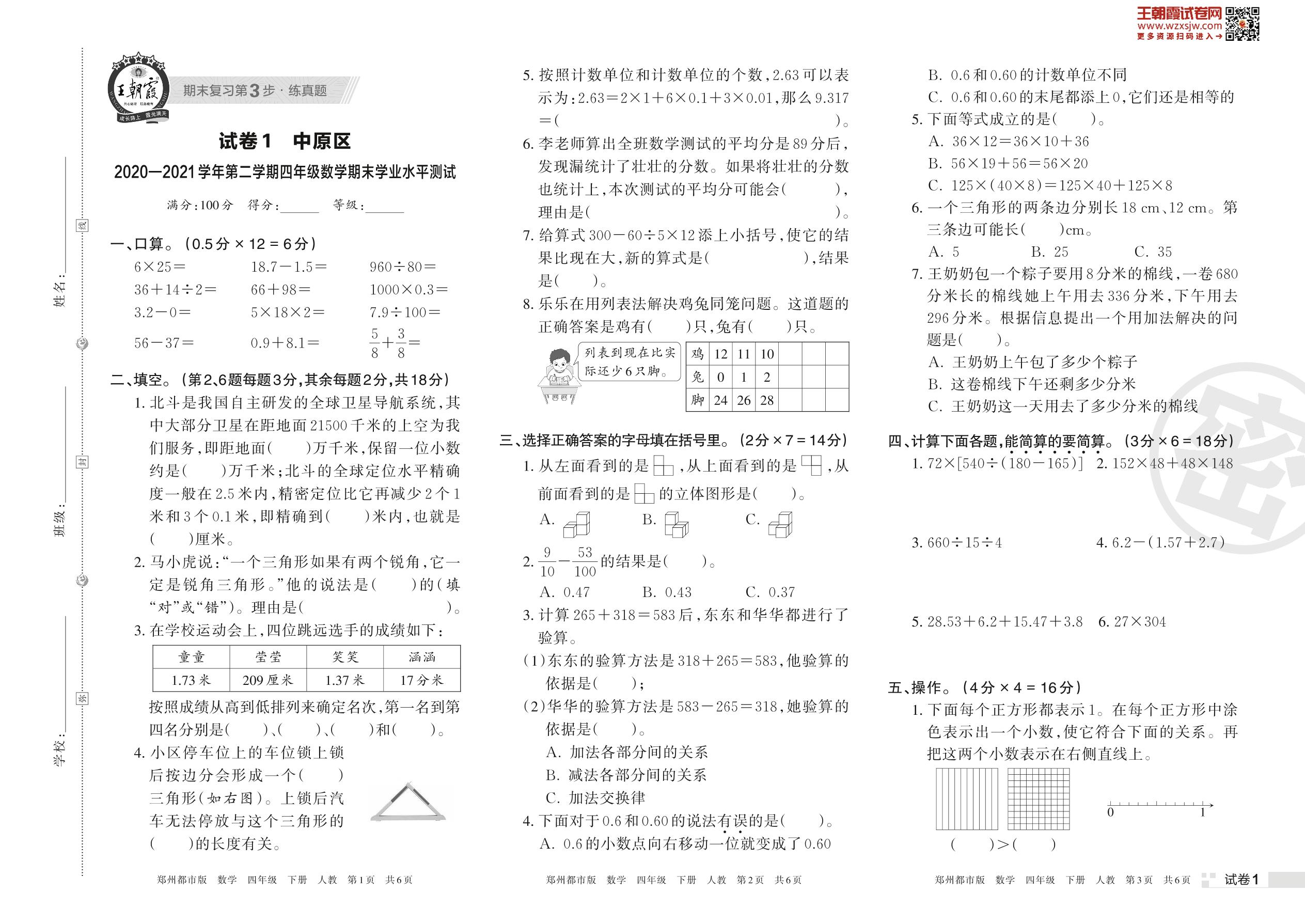 中原区2020—2021学年第二学期四年级数学期末学业水平测试(人教版)【1】