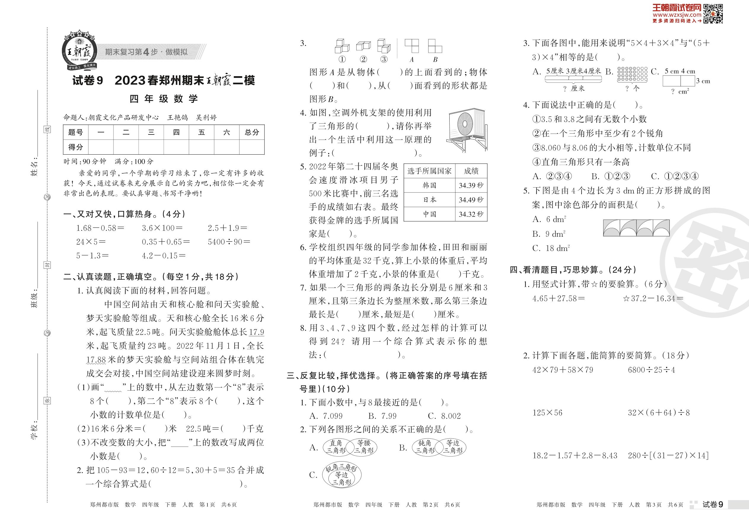 王朝霞期末模拟卷四年级下册数学(人教版)_R230426150207780【9】