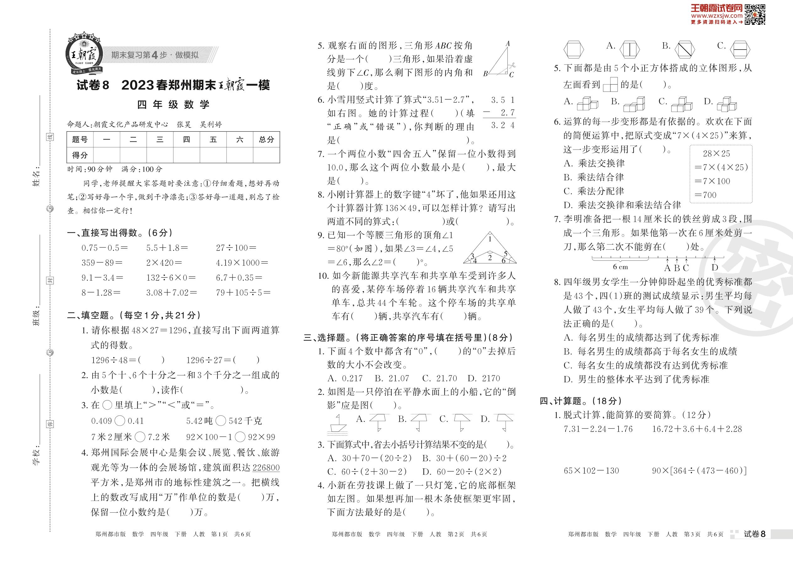 王朝霞期末模拟卷四年级下册数学(人教版)_R230426150207477【8】