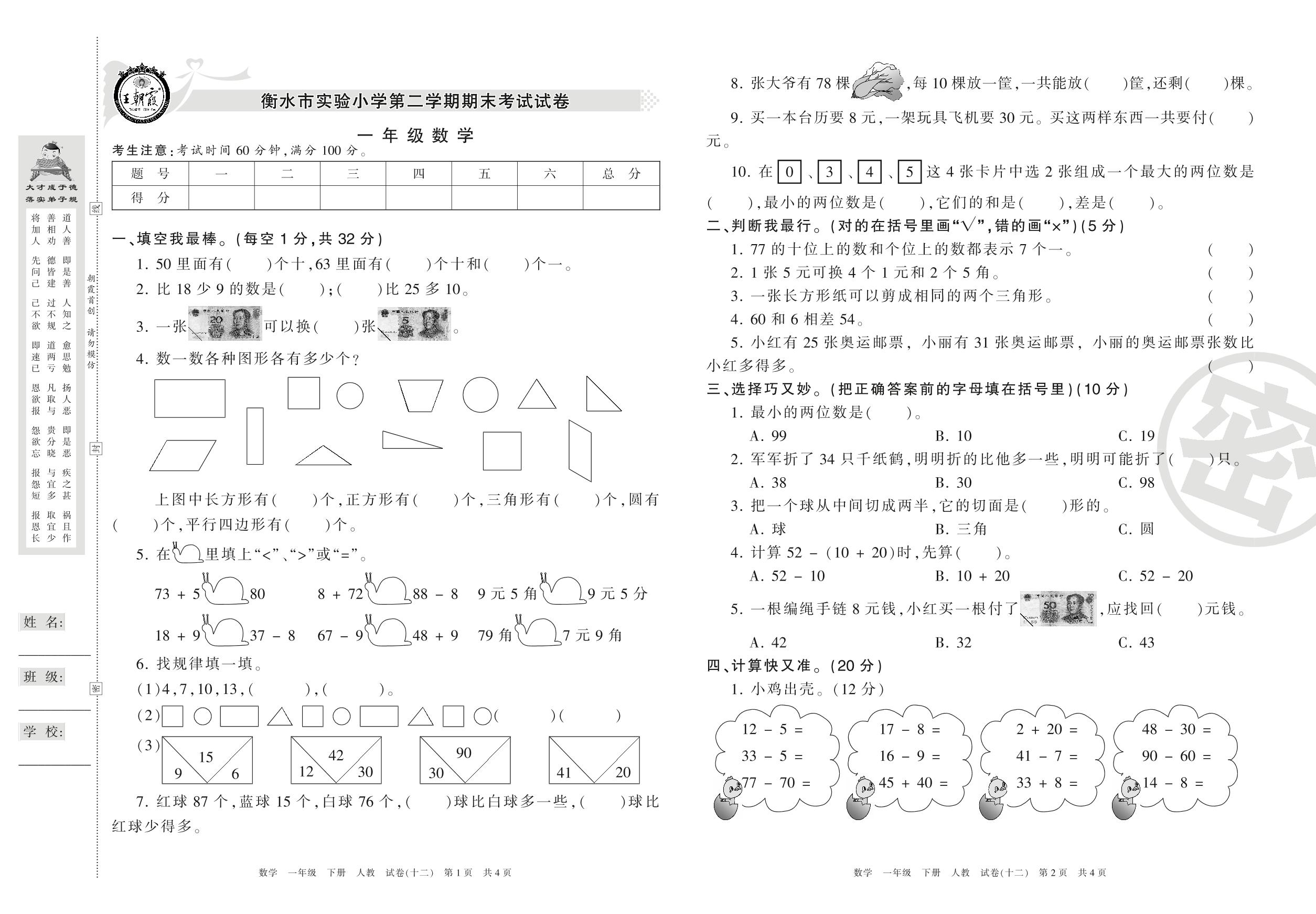 2015-2016学年第二学期衡水市实验小学一年级数学试卷(人教版)【12】