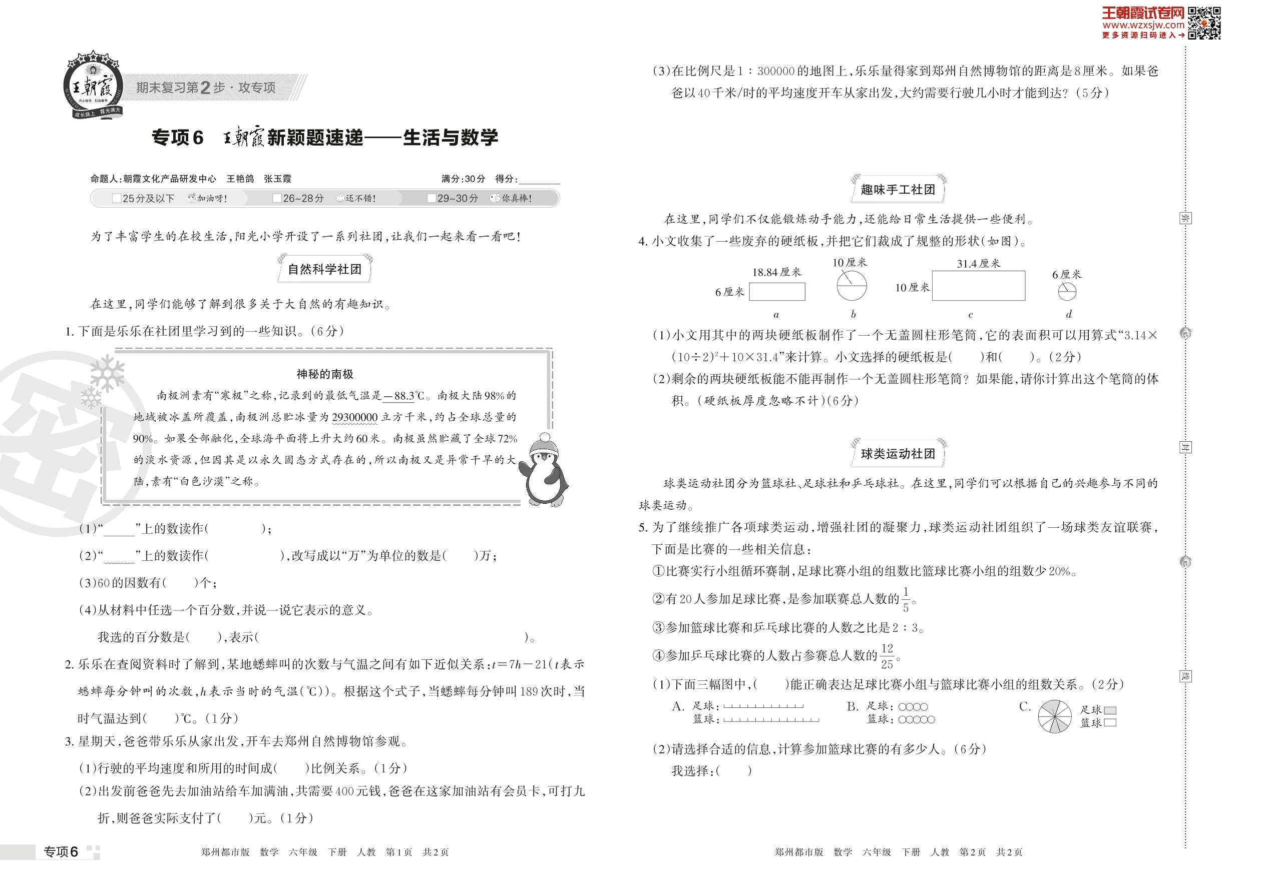 王朝霞期末专项卷——王朝霞新颖题速递:生活与数学六年级下册数学(人教版)_R230426151327407【6】