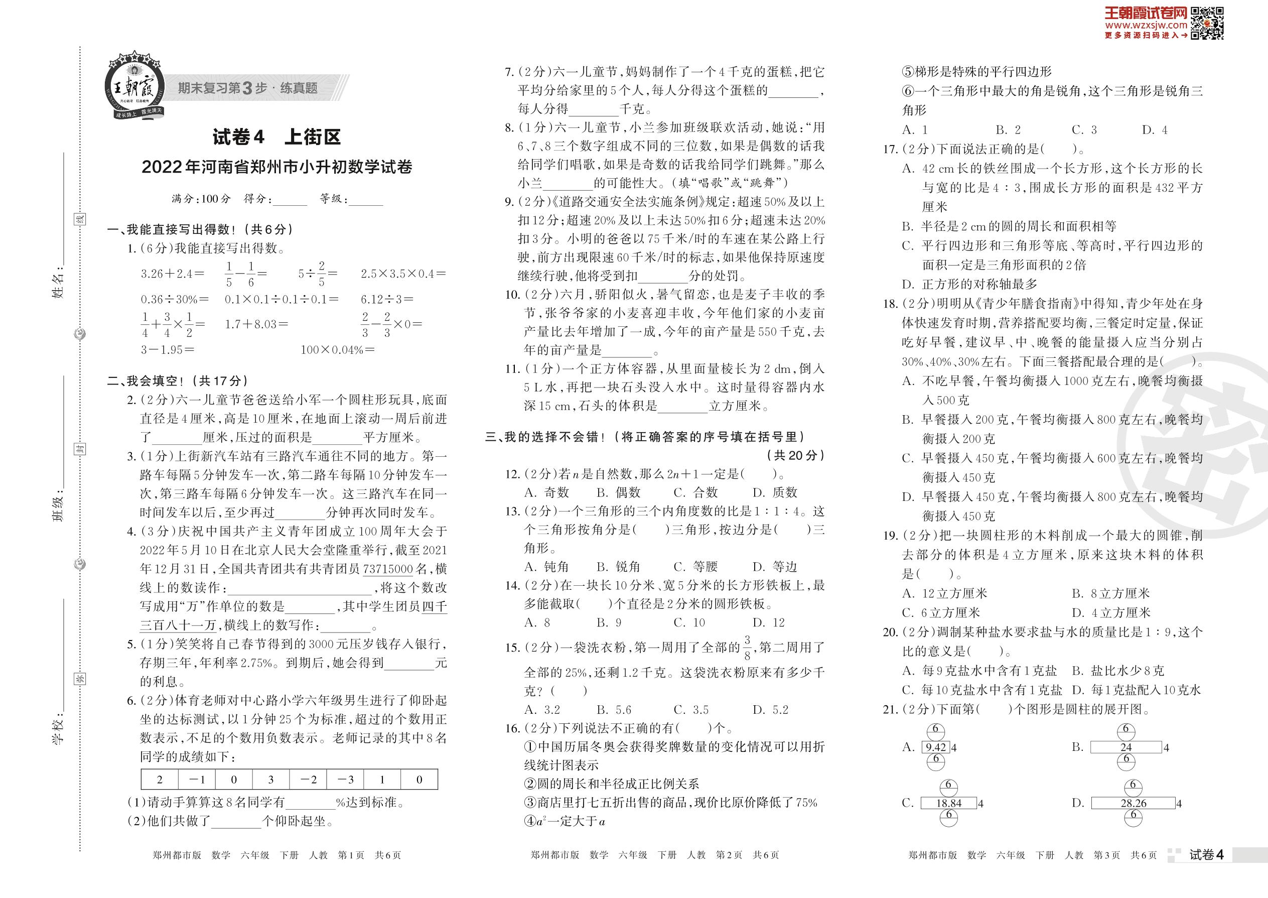 上街区2022年河南省郑州市小升初数学试卷(人教版)【4】