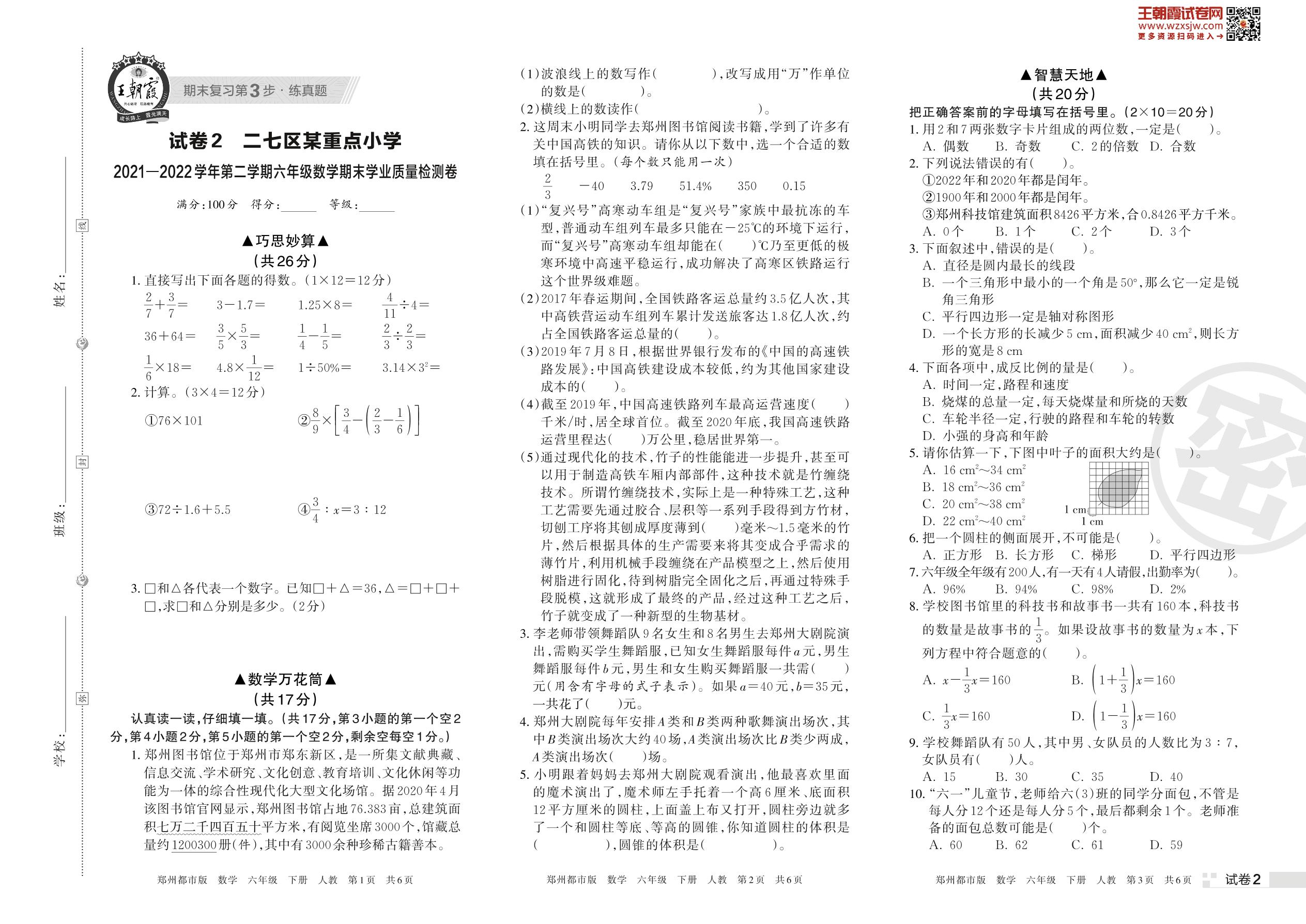 二七区某重点小学2021—2022学年第二学期六年级数学期末学业质量检测卷(人教版)【2】