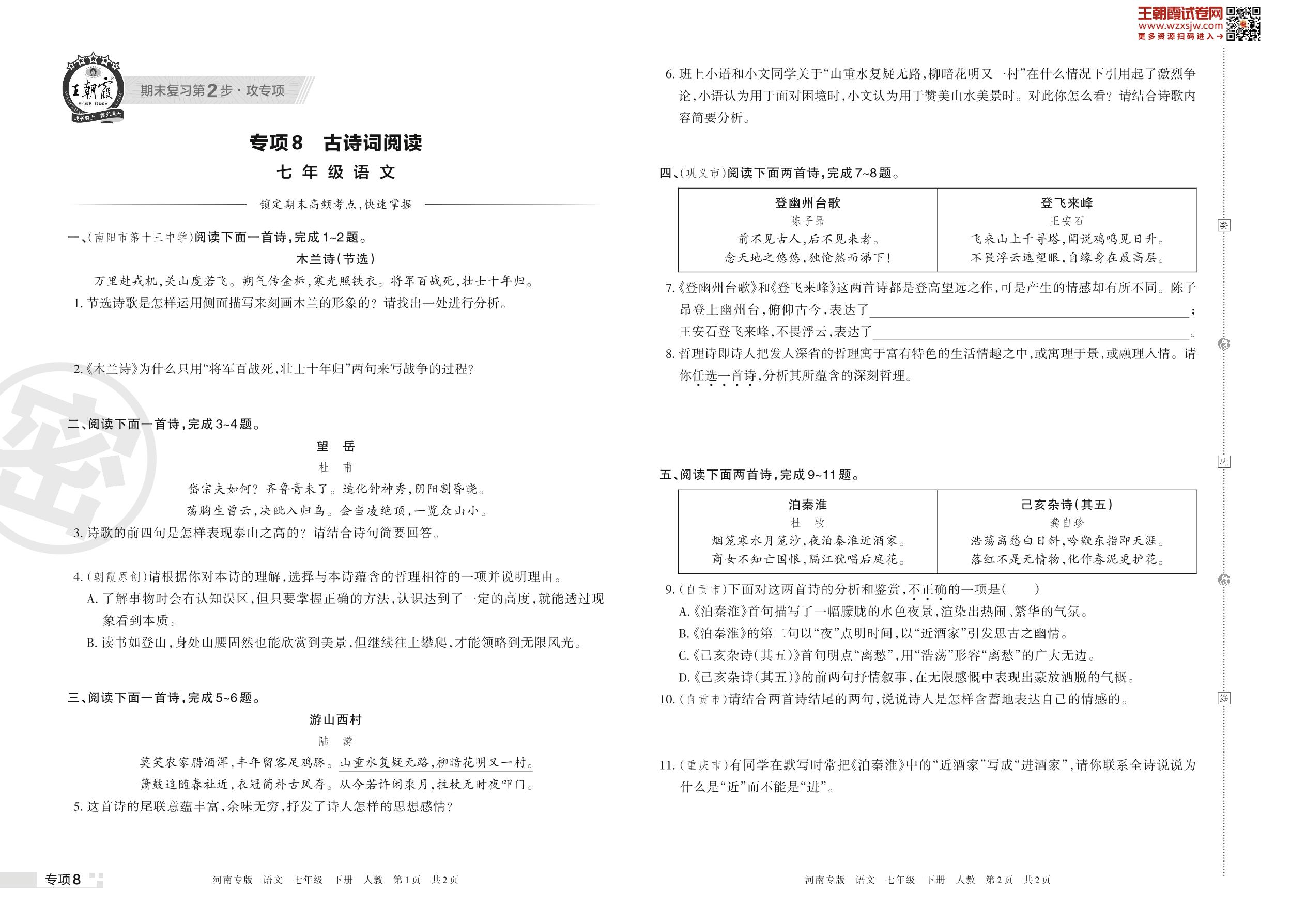 王朝霞期末专项卷——古诗词阅读七年级下册语文(人教版)_R230426162652216【8】
