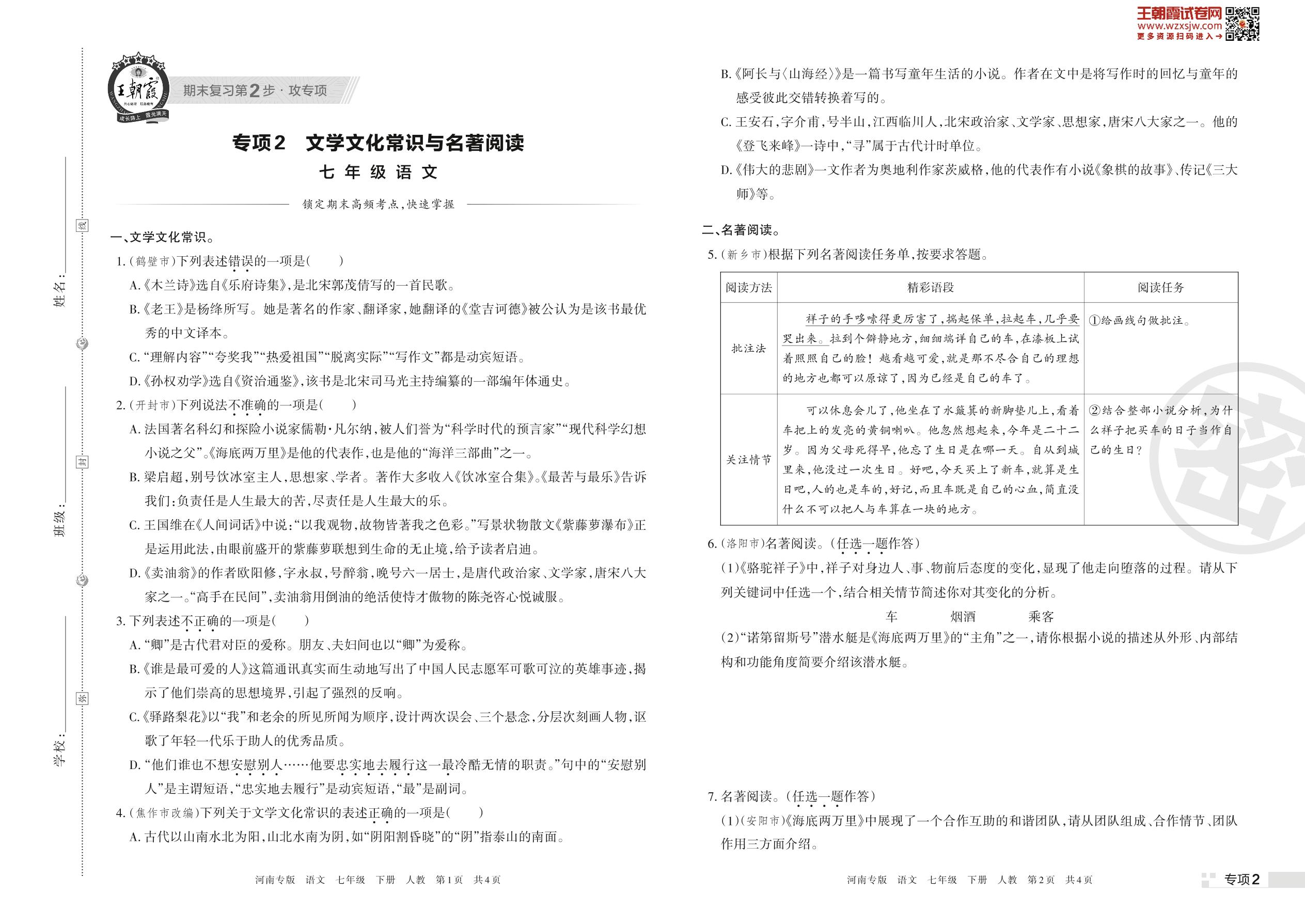 王朝霞期末专项卷——文学文化常识与名著阅读七年级下册语文(人教版)_R230426162652316【2】