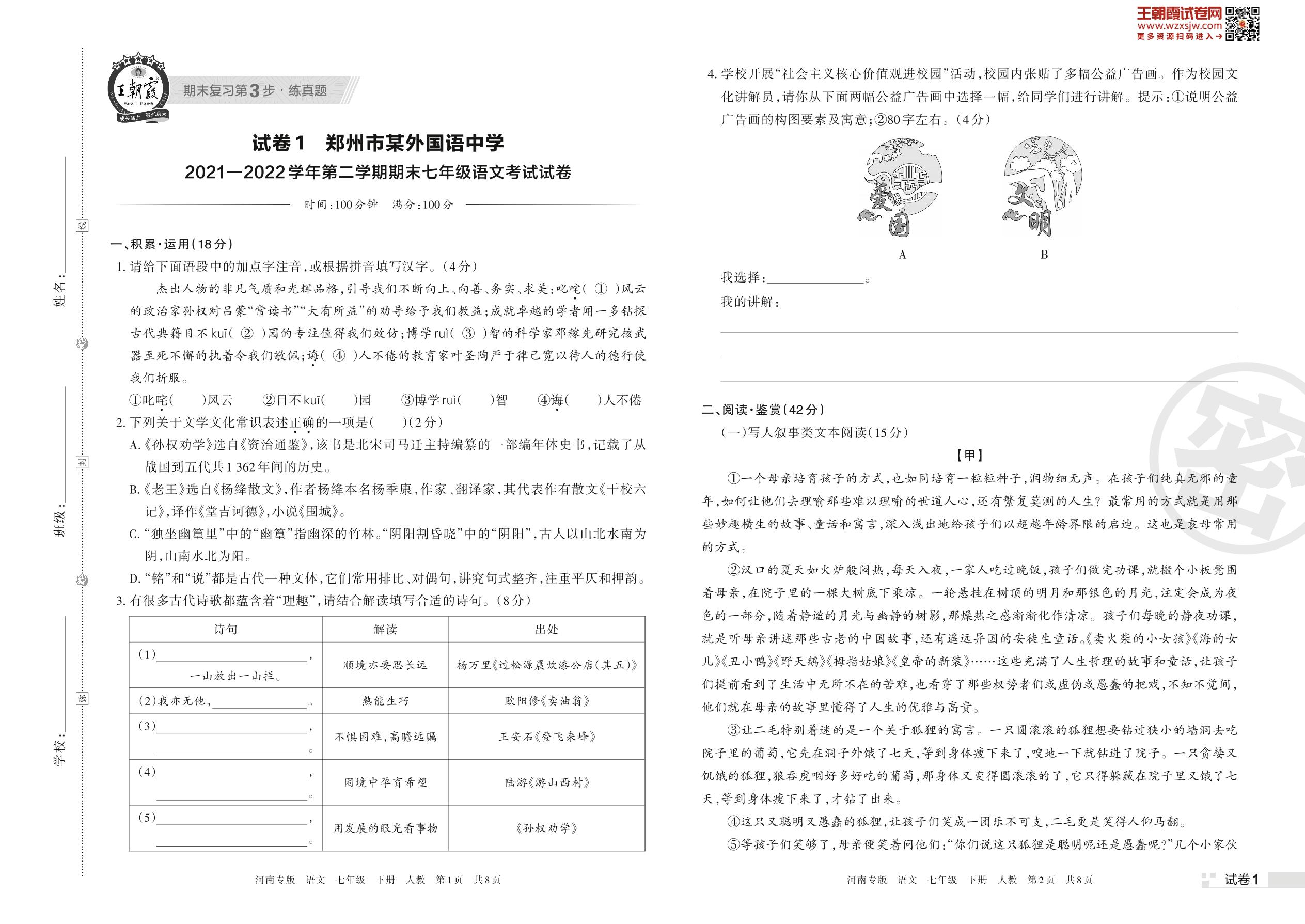 郑州市某外国语中学2021—2022学年第二学期期末七年级语文考试试卷(人教版)【1】