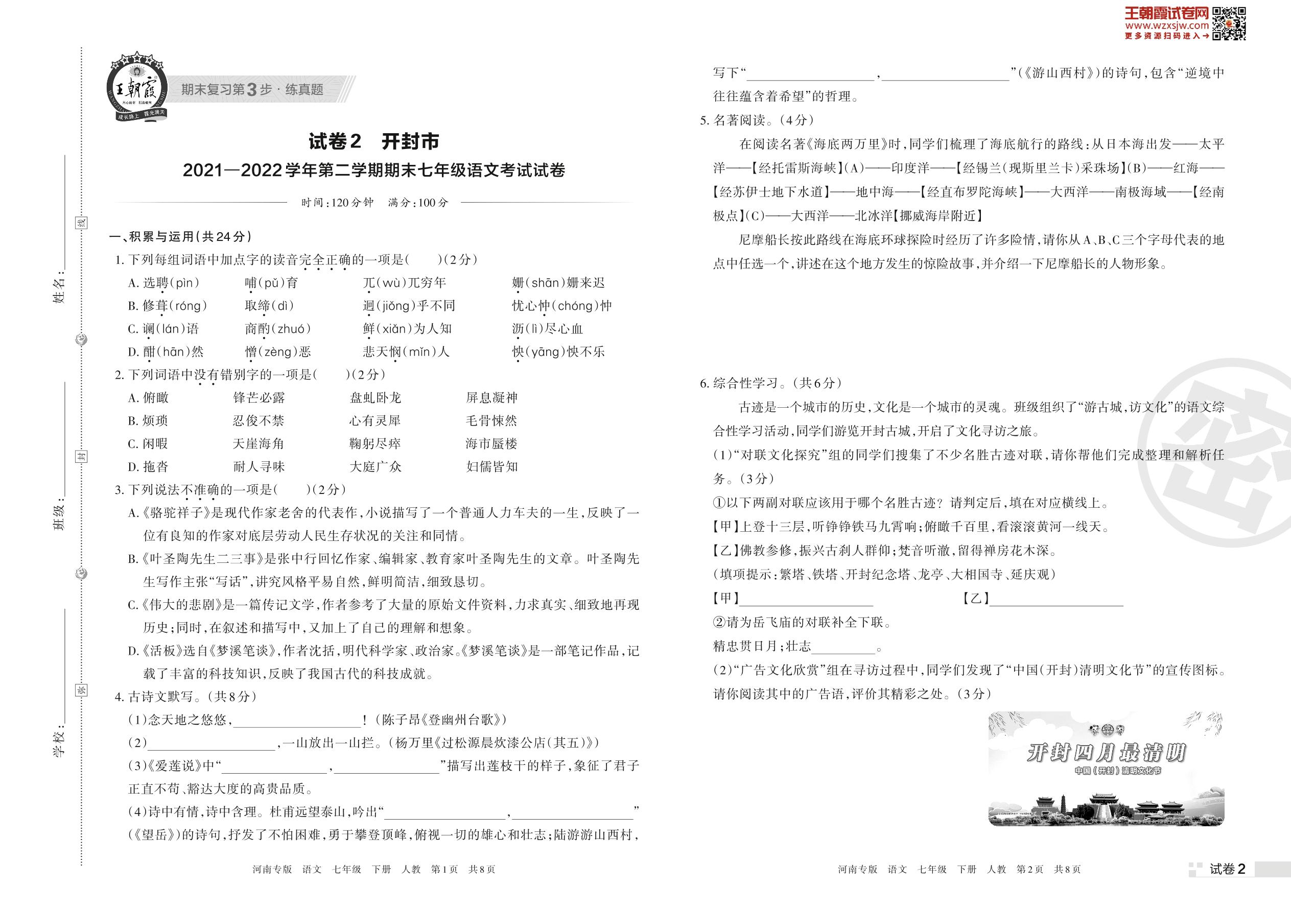 开封市2021—2022学年第二学期期末七年级语文考试试卷(人教版)【2】