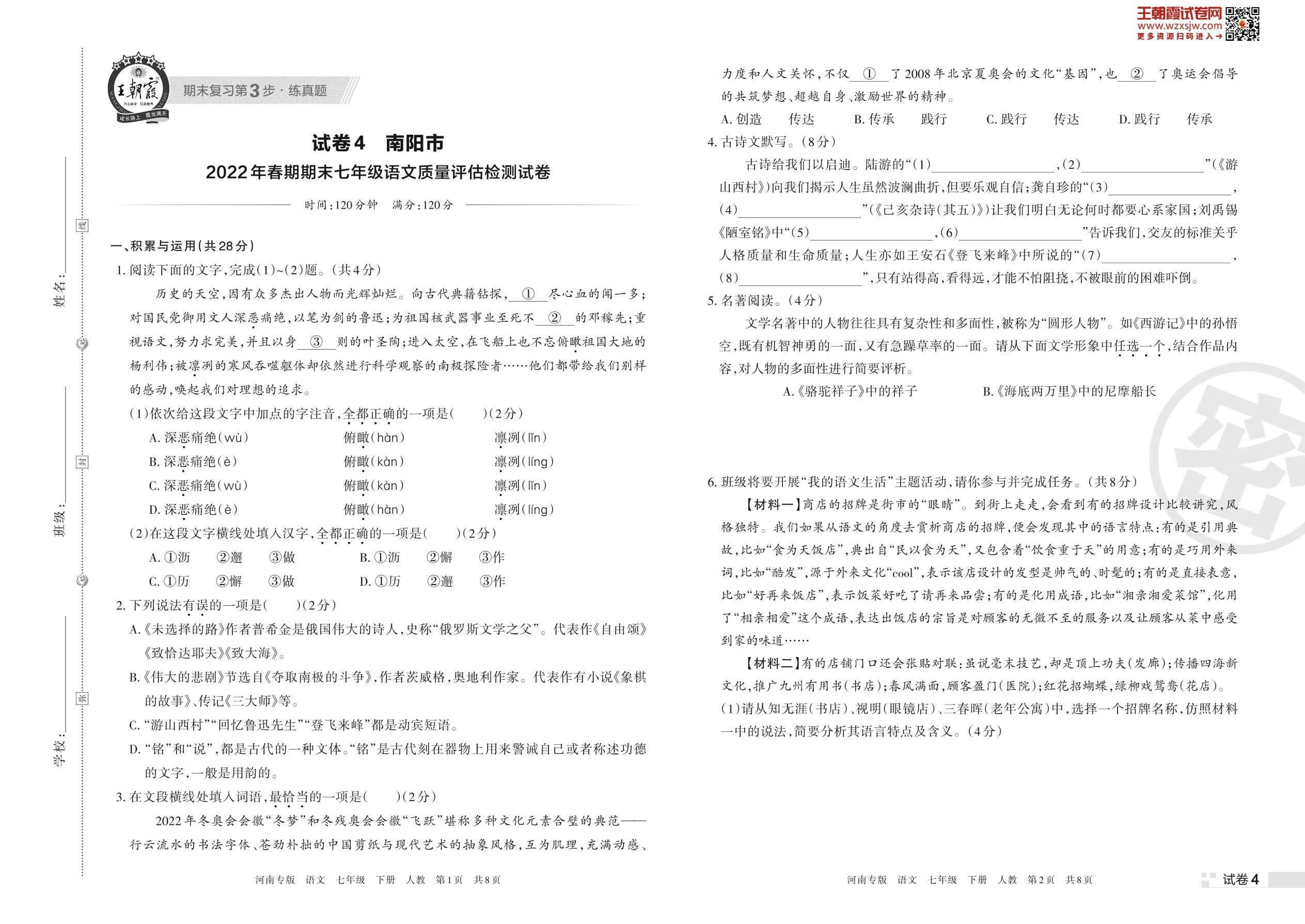 南阳市2022年春期期末七年级语文质量评估检测试卷(人教版)【4】