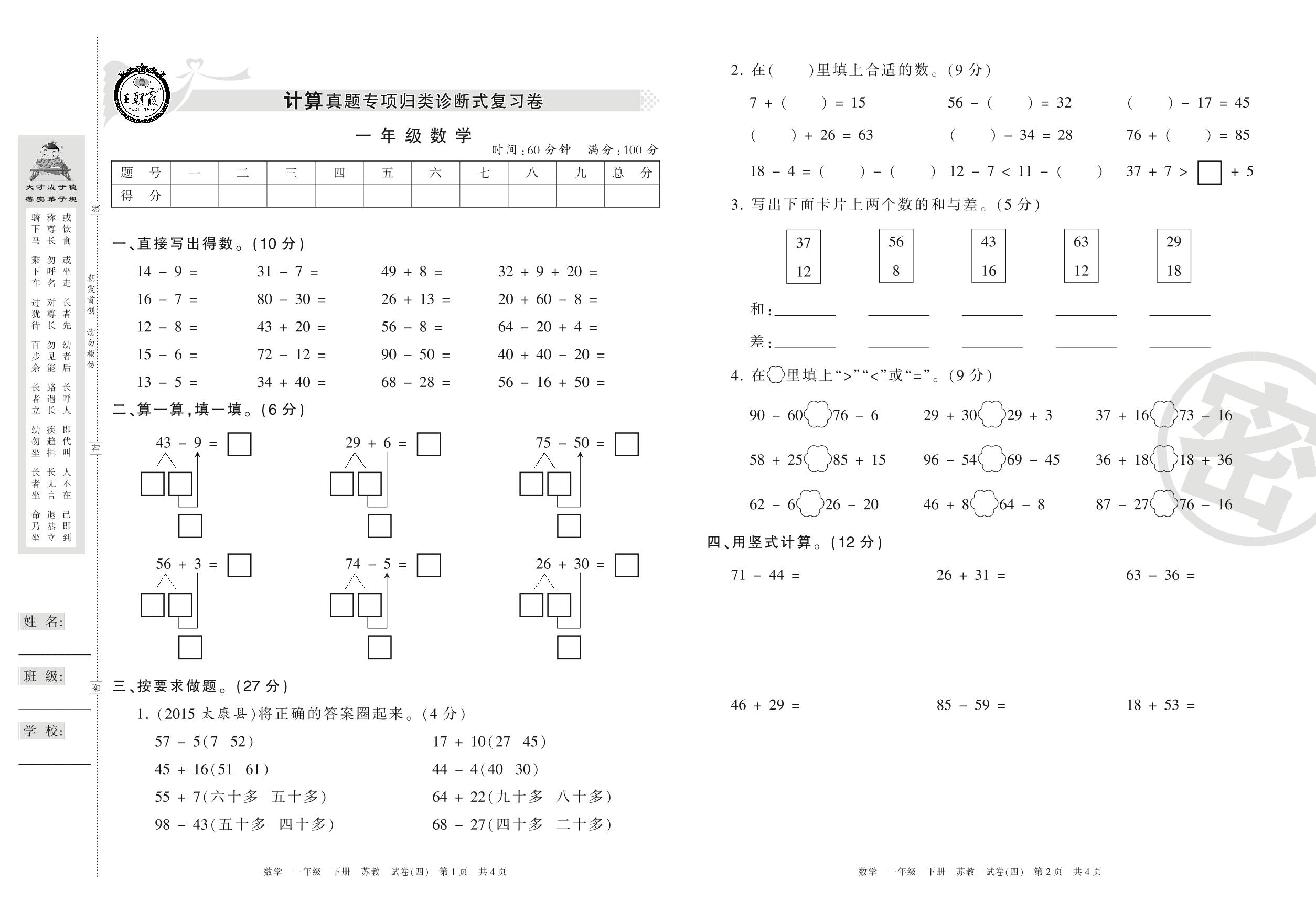 王朝霞期末专项卷一年级下册数学(苏教版)_R210802221611【4】
