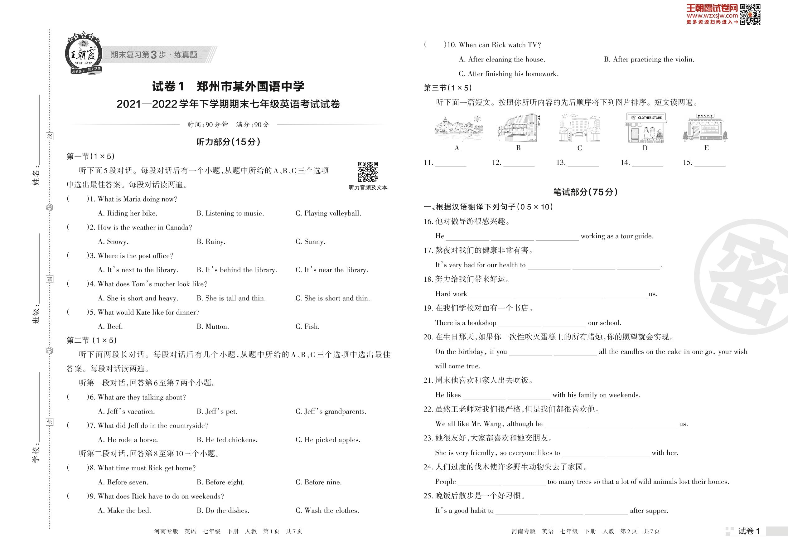 郑州市某外国语中学2021—2022学年下学期期末七年级英语考试试卷(人教版)【1】
