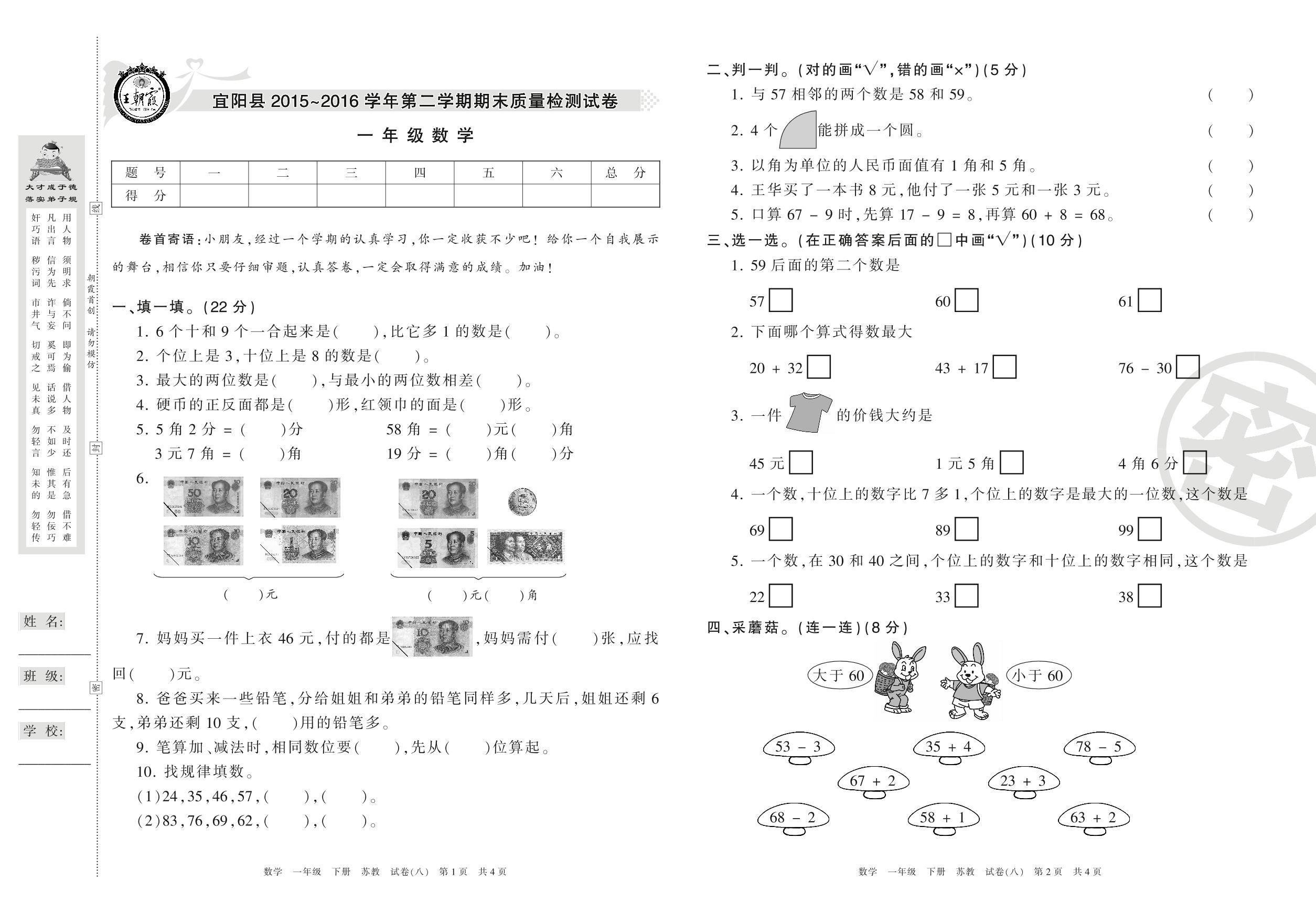 2015-2016学年第二学期洛阳市宜阳县一年级数学试卷(苏教版)【8】