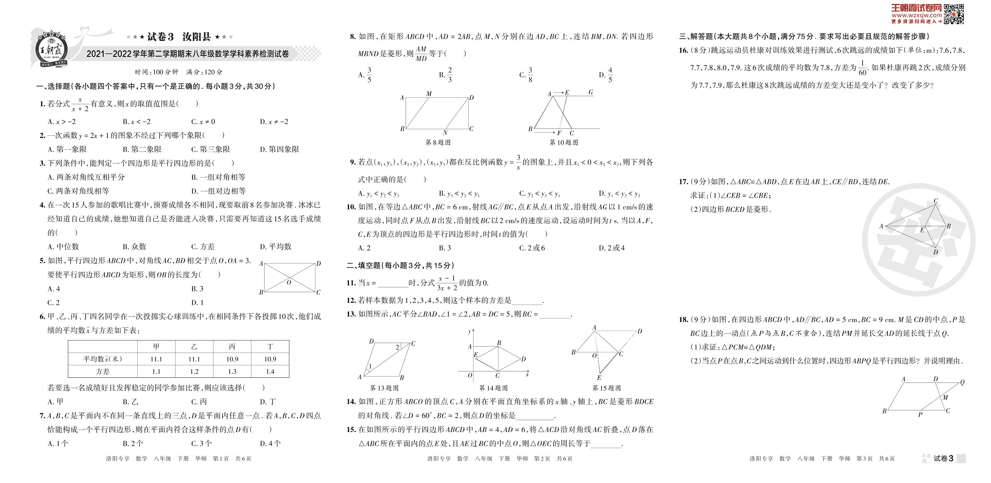 汝阳县2021—2022学年第二学期期末八年级数学学科素养检测试卷(华师版)【3】