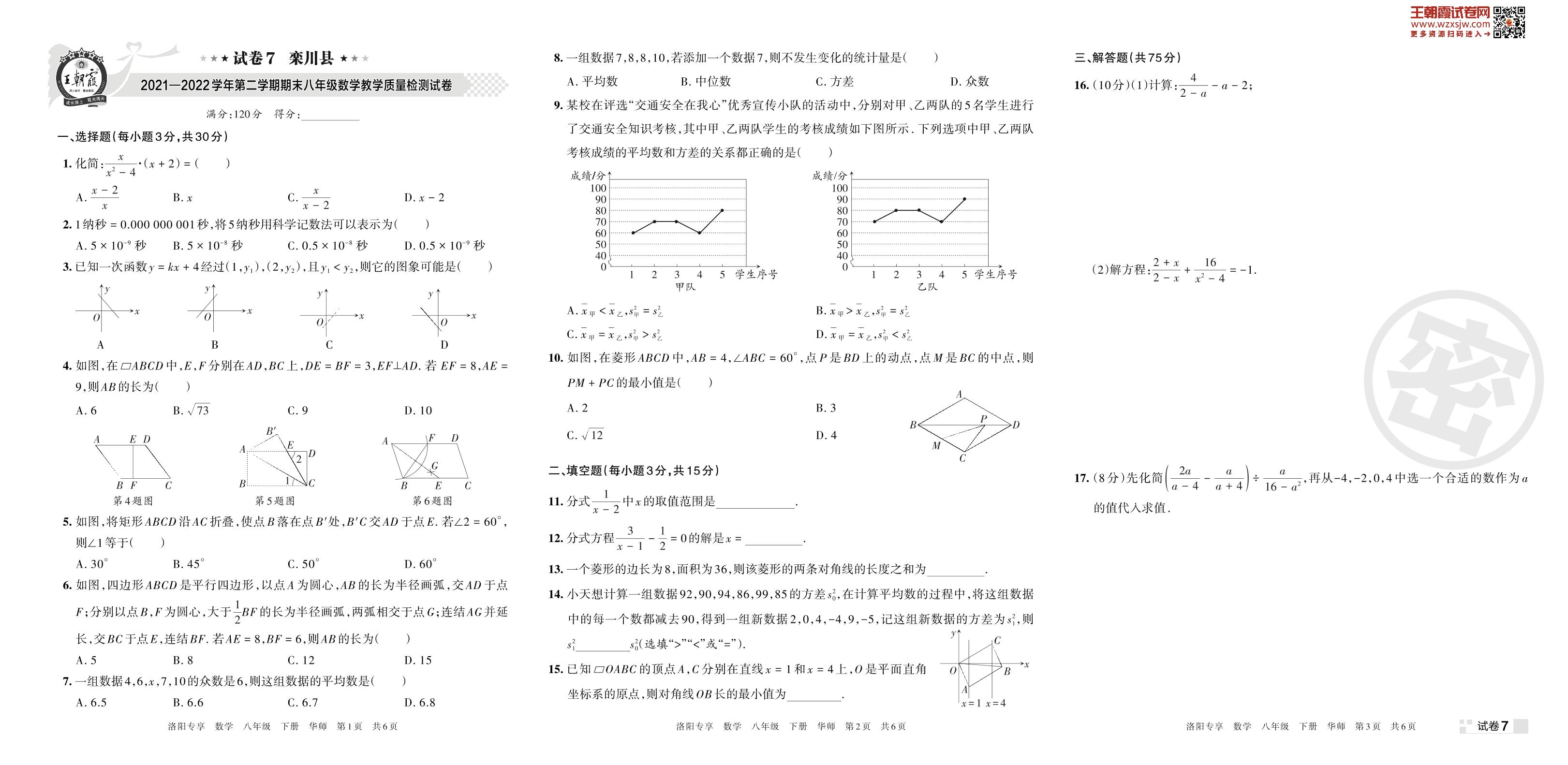 栾川县2021—2022学年第二学期期末八年级数学教学质量检测试卷(华师版)【7】
