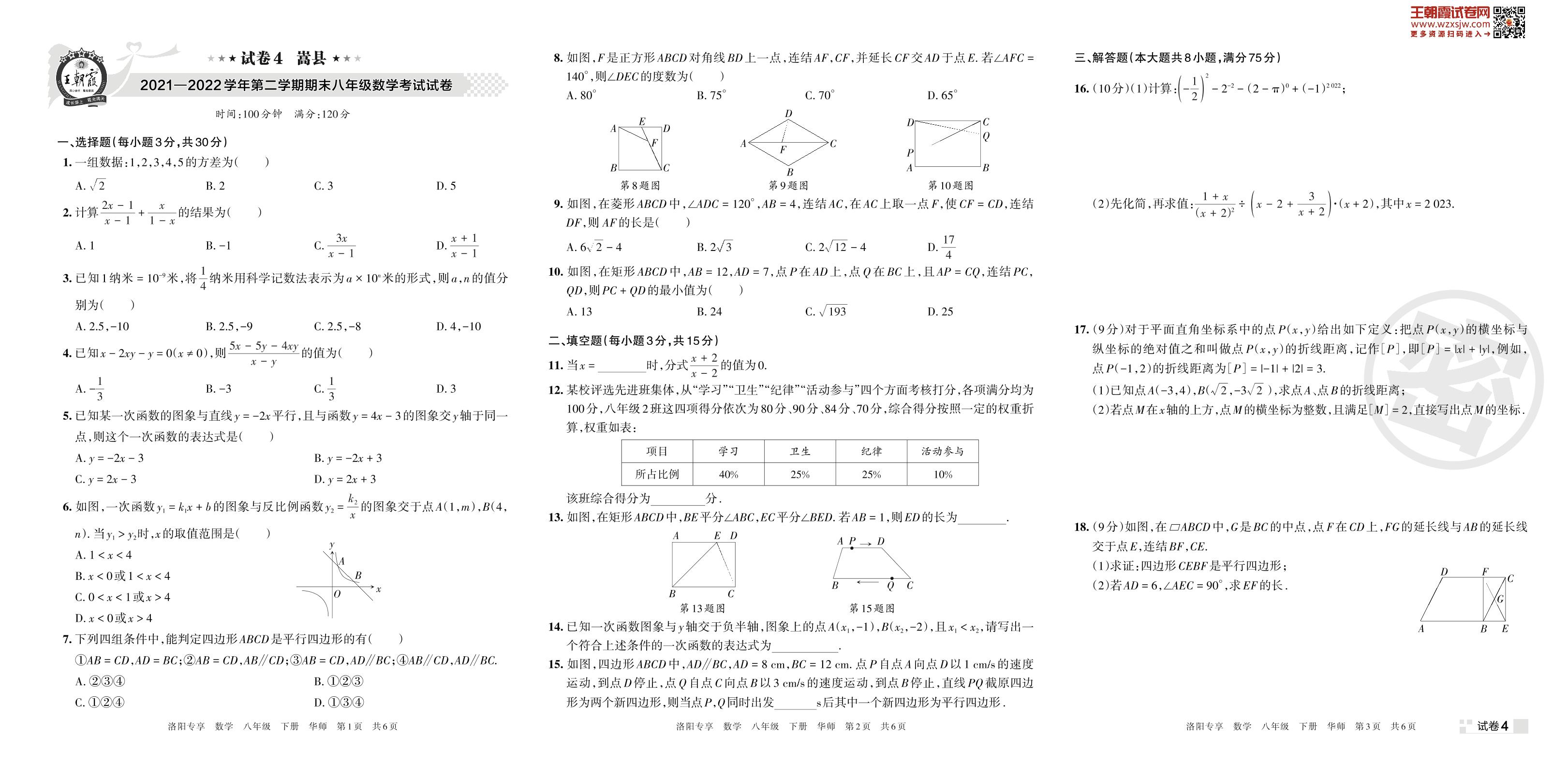 嵩县2021—2022学年第二学期期末八年级数学考试试卷(华师版)【4】