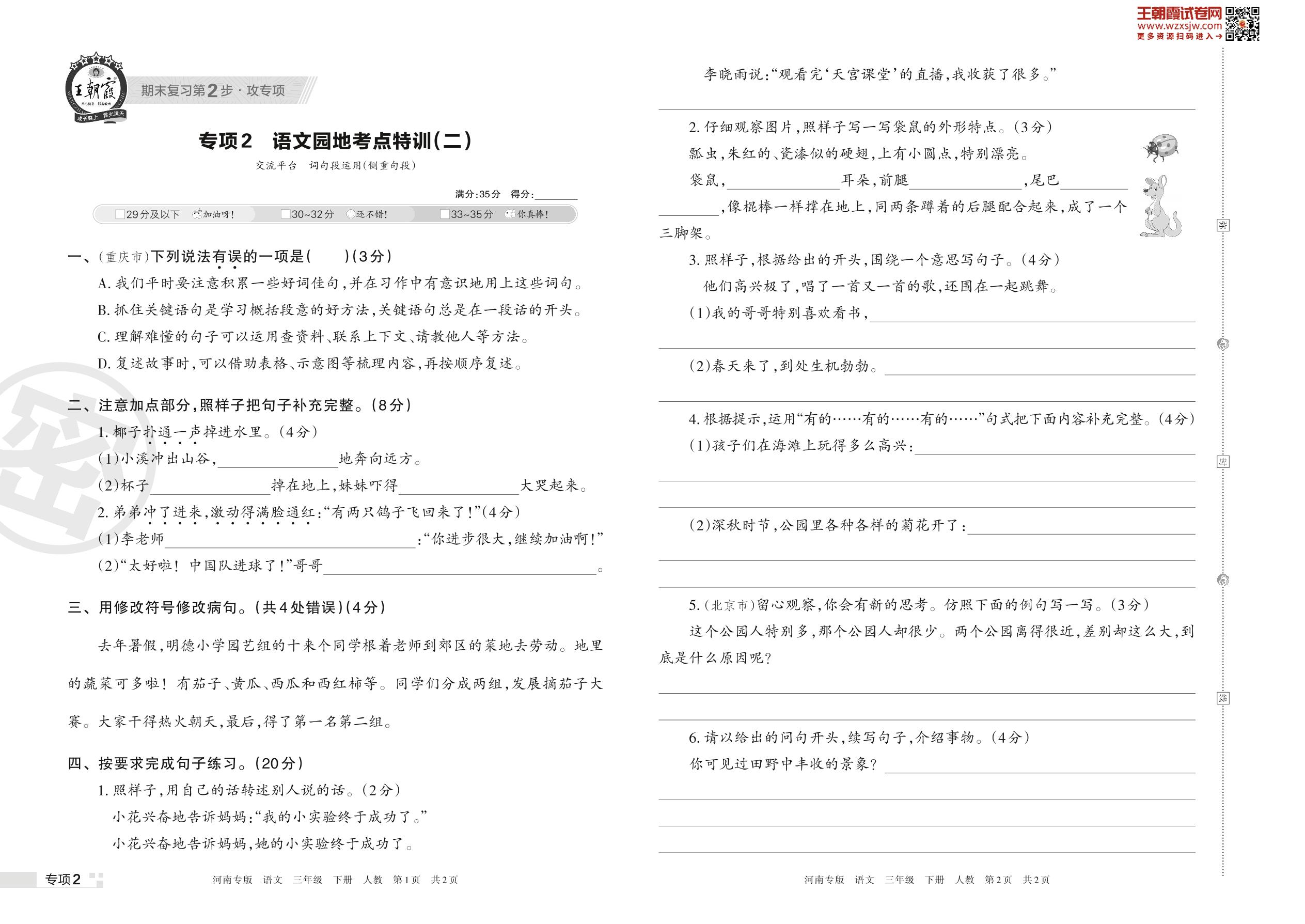 王朝霞期末专项卷——语文园地考点特训(二)三年级下册语文(人教版)_R230426164353750【2】