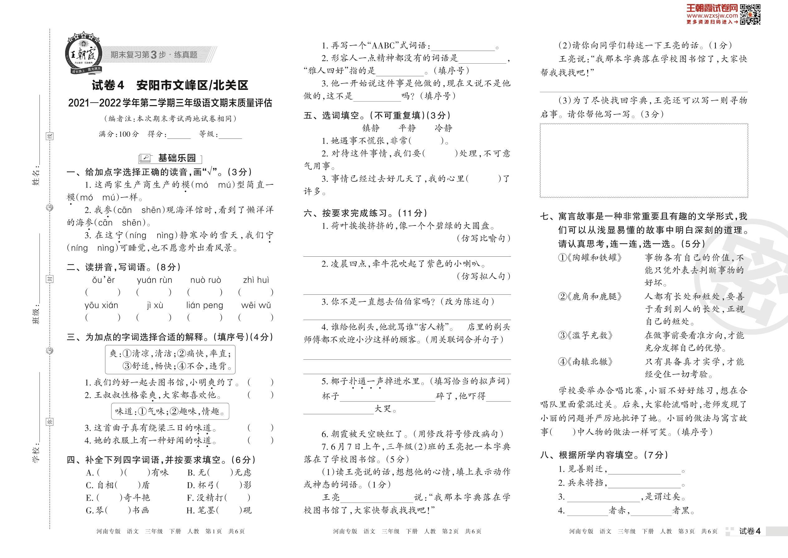 安阳市文峰区、北关区2021—2022学年第二学期三年级语文期末质量评估(人教版)【4】