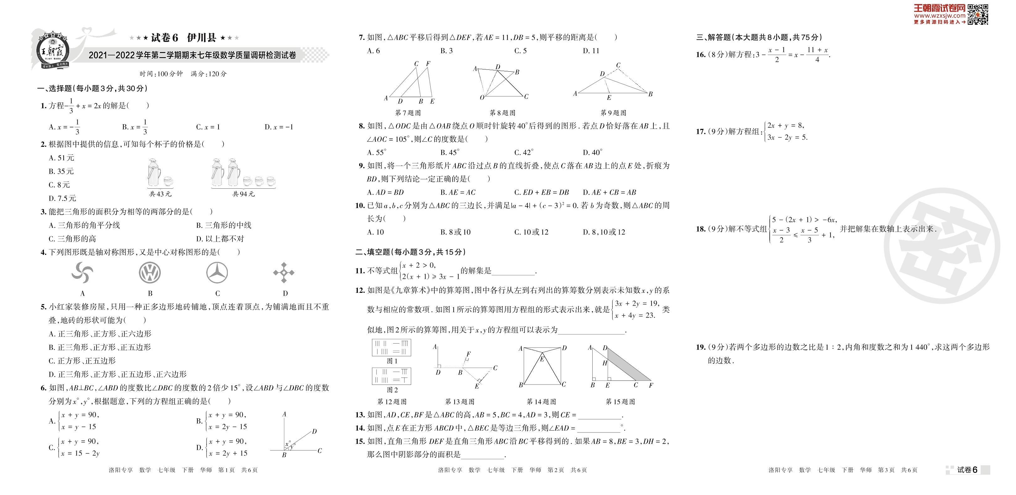 伊川县2021—2022学年第二学期期末七年级数学质量调研检测试卷(华师版)【6】