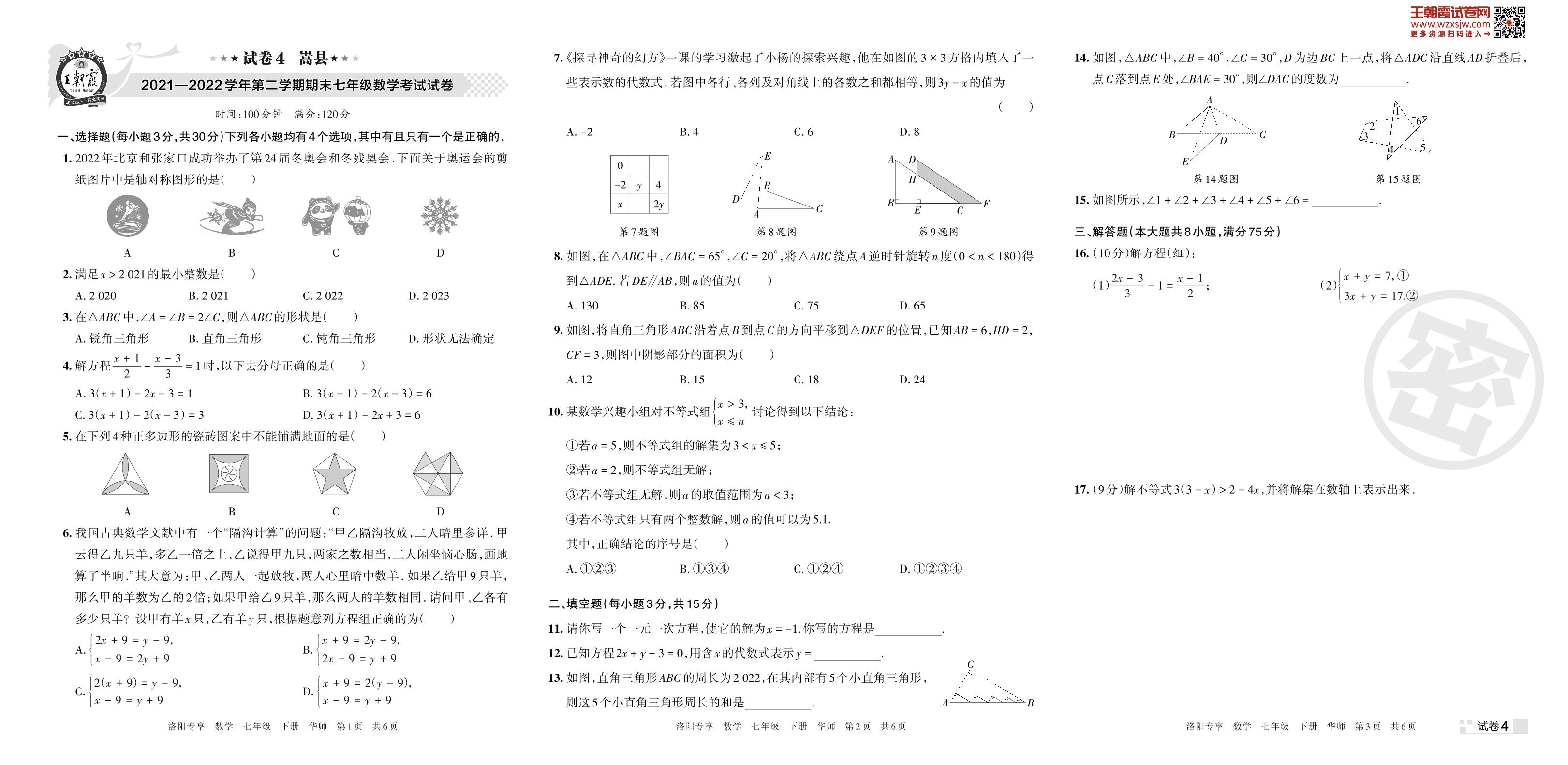 嵩县2021—2022学年第二学期期末七年级数学考试试卷(华师版)【4】