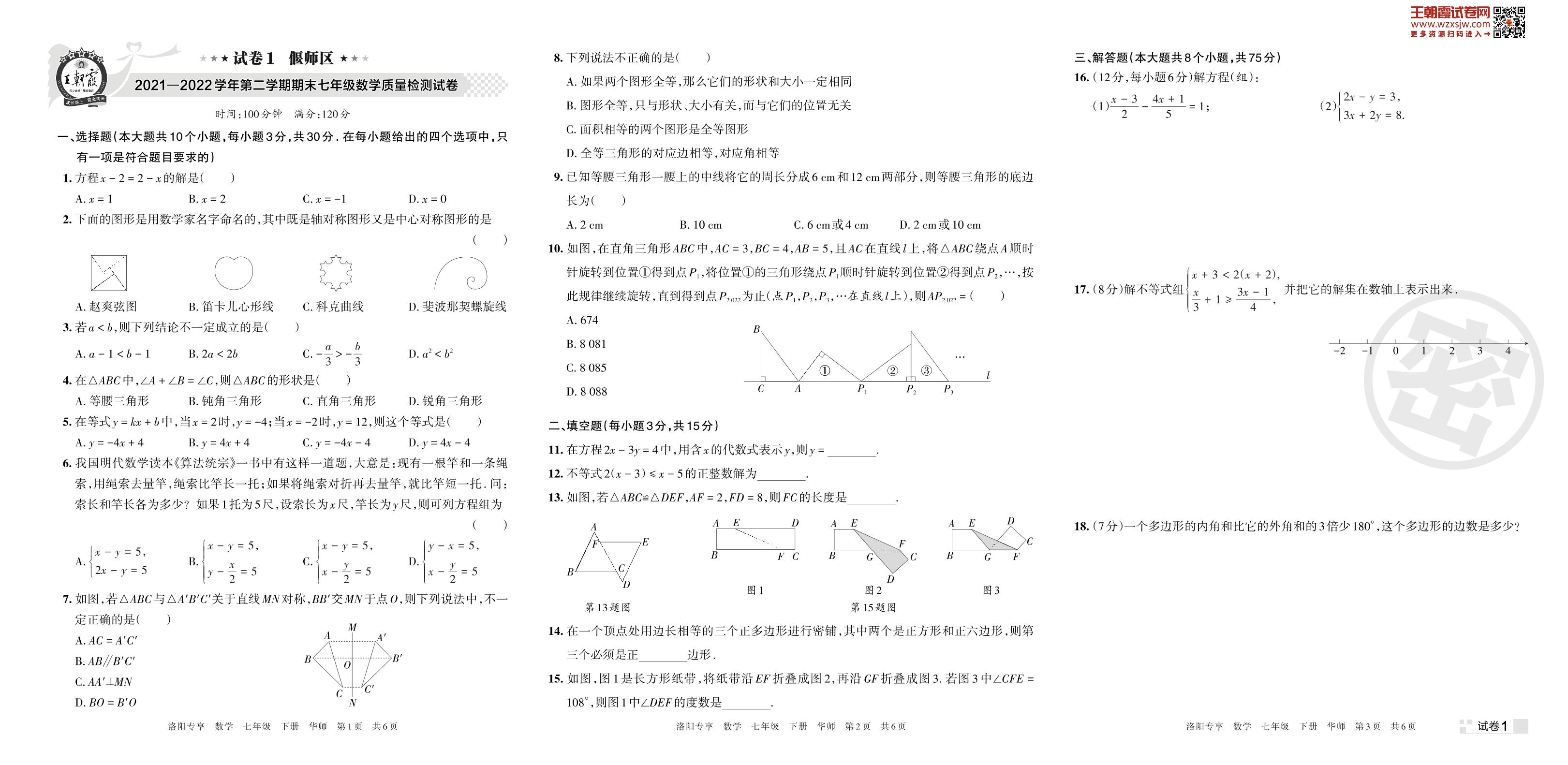 偃师区2021—2022学年第二学期期末七年级数学质量检测试卷(华师版)【1】