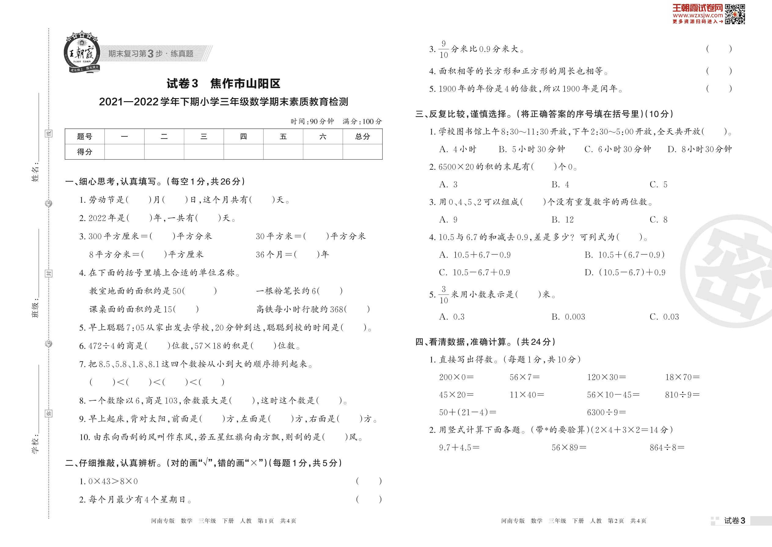 焦作市山阳区2021—2022学年下期小学三年级数学期末素质教育检测(人教版)【3】