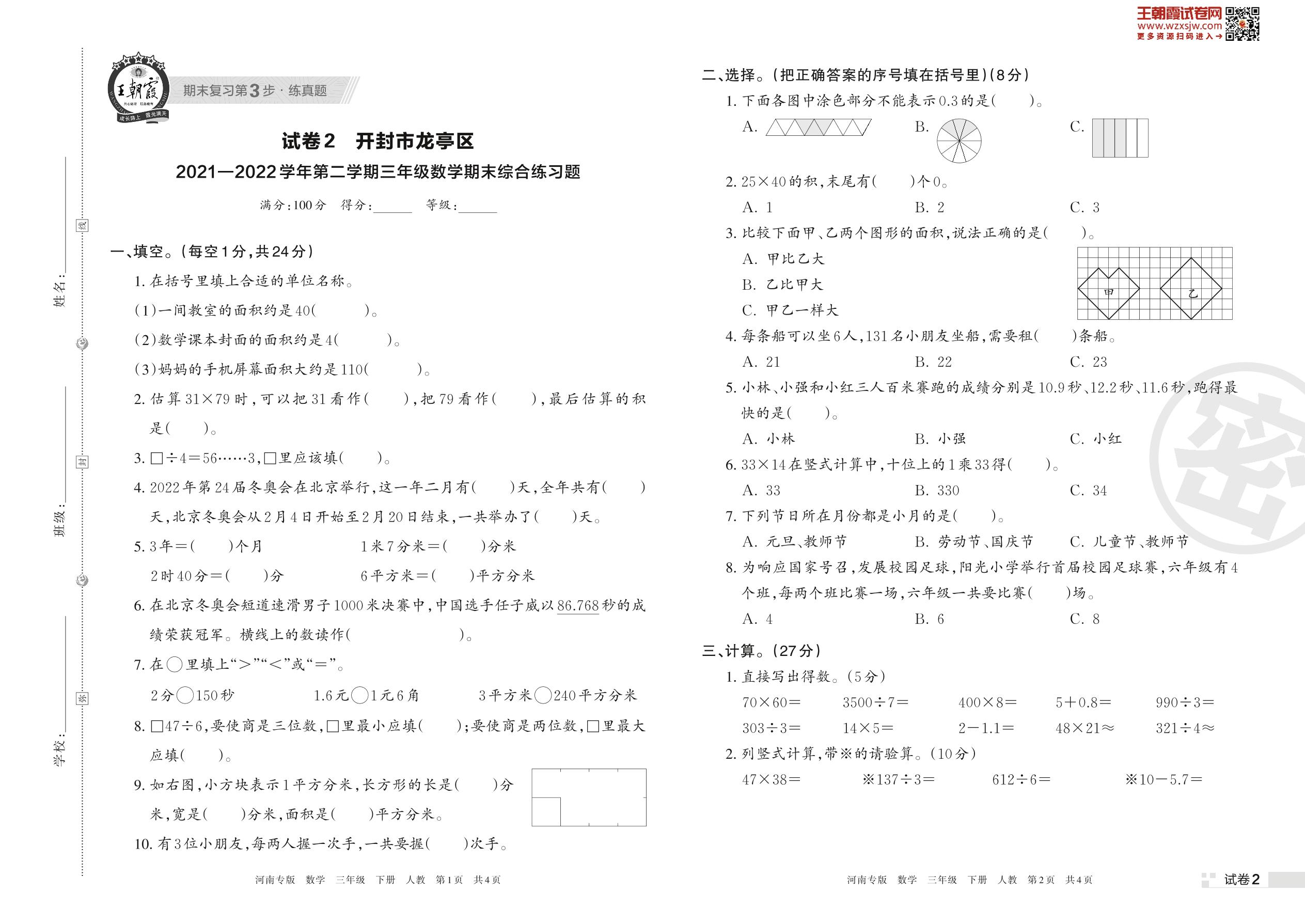 开封市龙亭区2021—2022学年第二学期三年级数学期末综合练习题(人教版)【2】