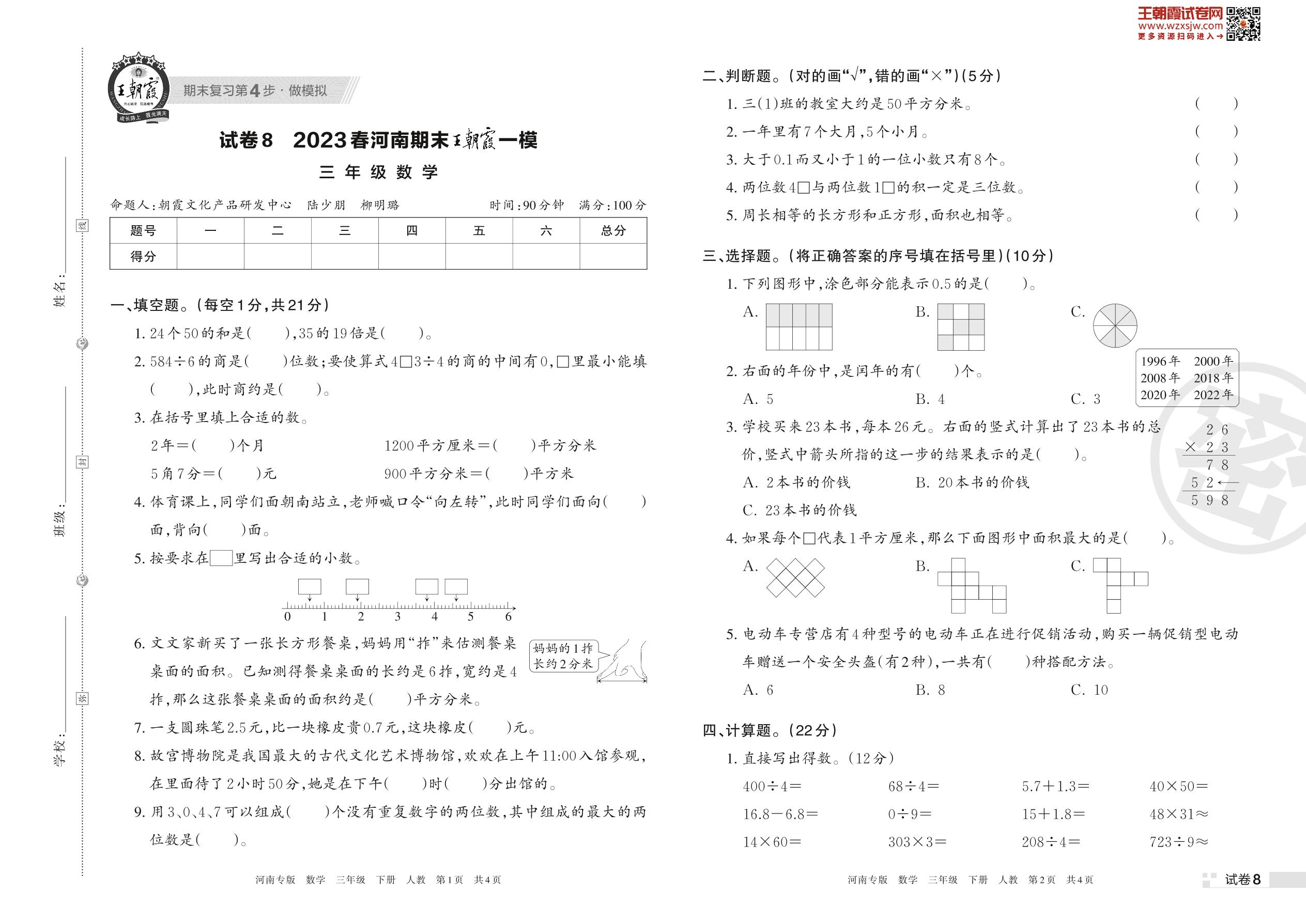 王朝霞期末模拟卷三年级下册数学(人教版)_R230426165029846【8】