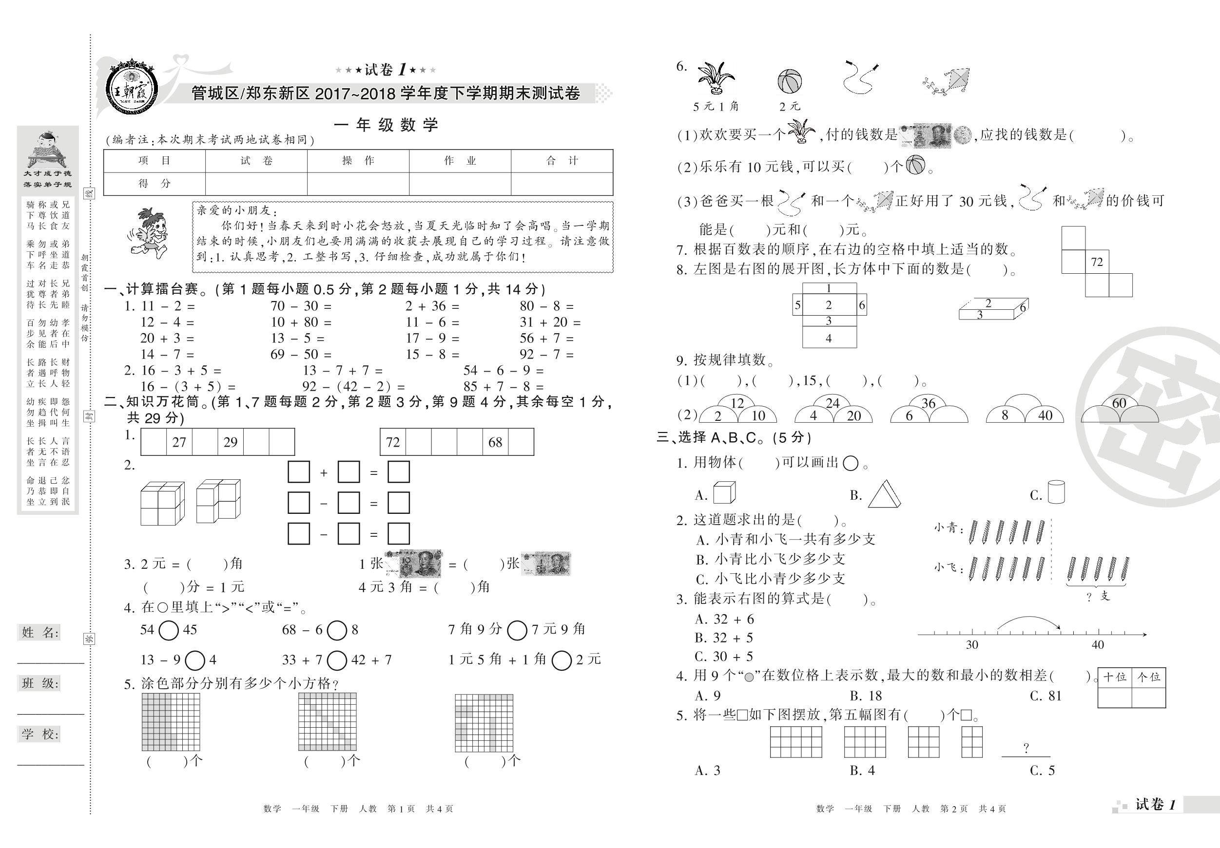 2017-2018学年第二学期郑州市管城区、郑东新区一年级数学试卷(人教版)【1】