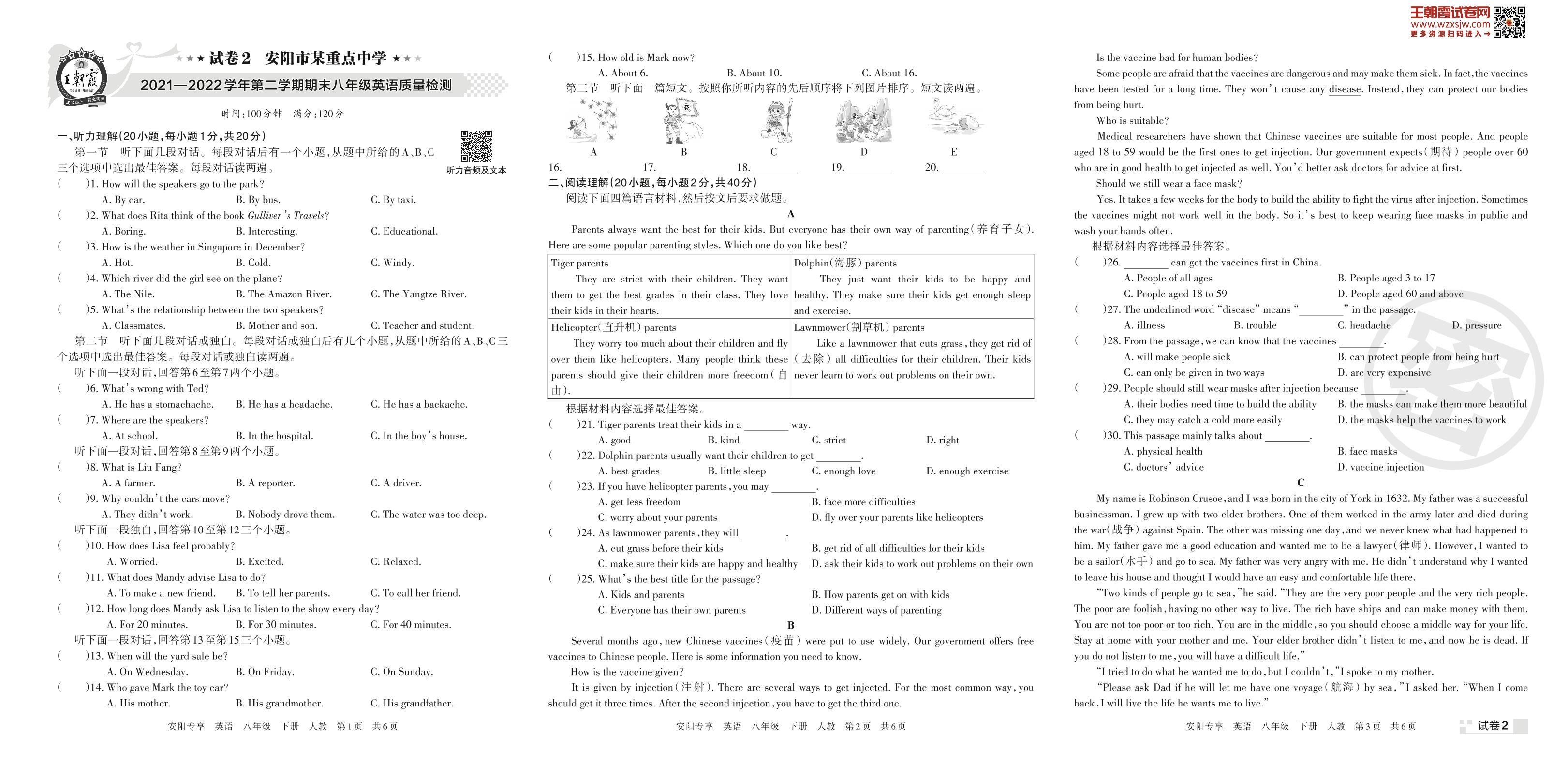 安阳市某重点中学2021—2022学年第二学期期末八年级英语质量检测(人教版)【2】