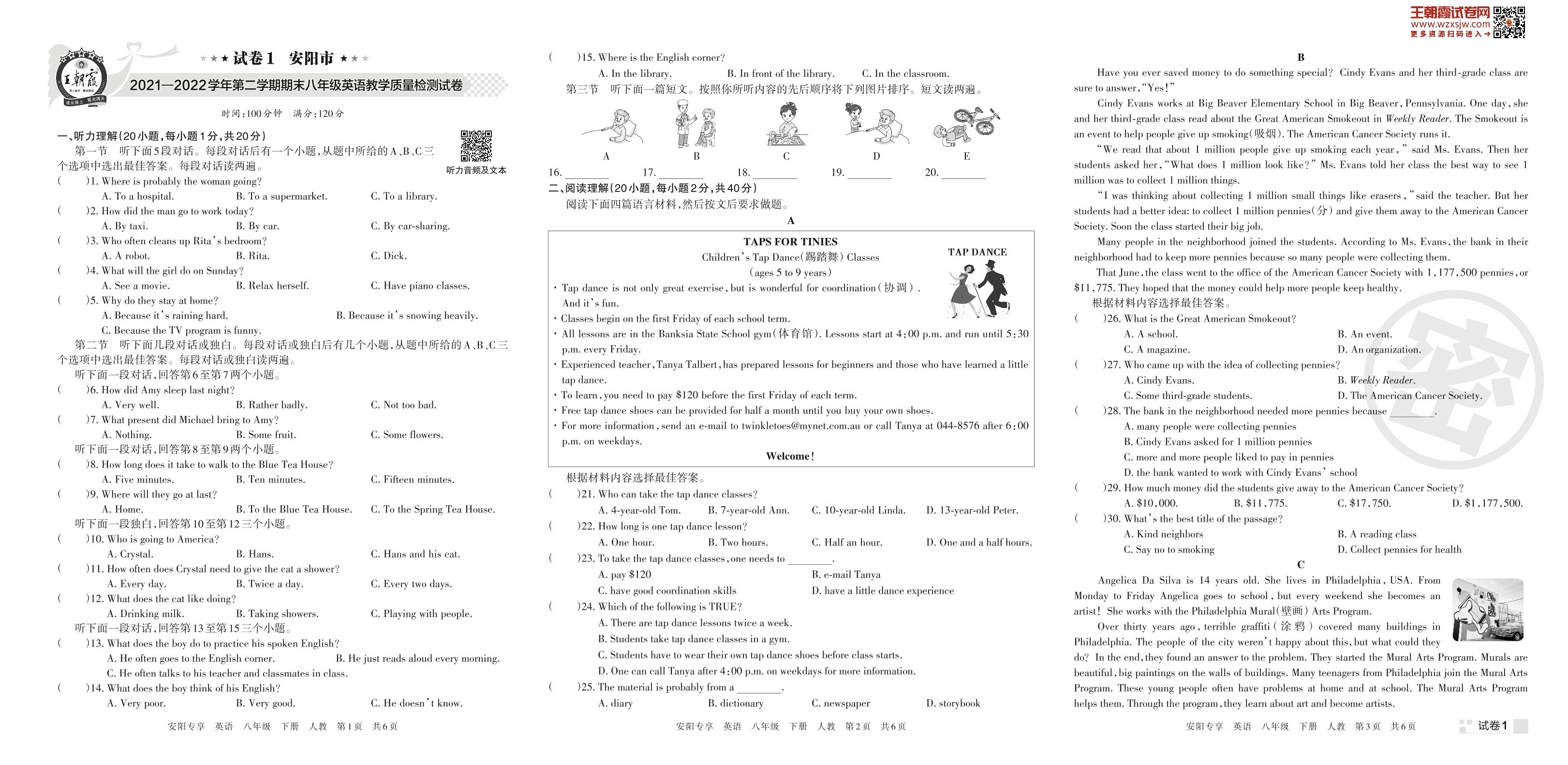 安阳市2021—2022学年第二学期期末八年级英语教学质量检测试卷(人教版)【1】