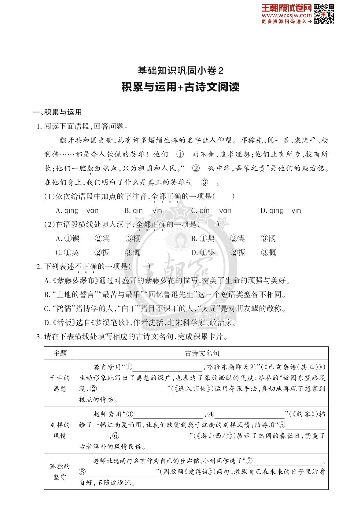 王朝霞期末过课本——基础知识巩固小卷2七年级下册语文(人教版)_R230427140727722