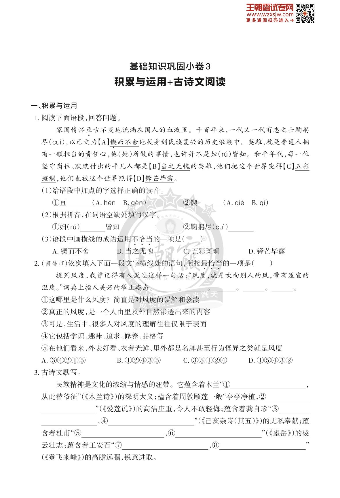 王朝霞期末过课本——基础知识巩固小卷3七年级下册语文(人教版)_R230427140727429