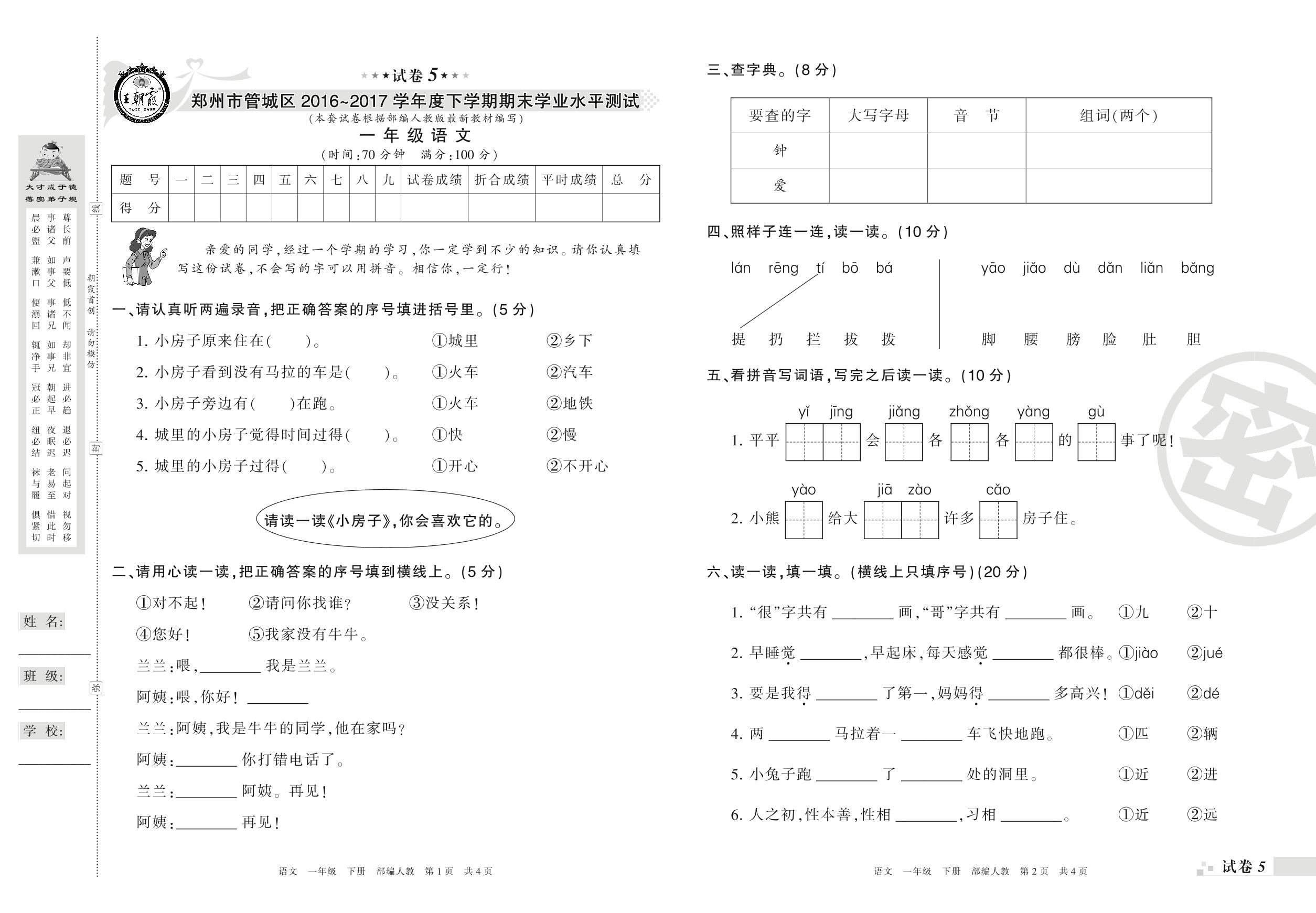 2016-2017学年第二学期郑州市管城区一年级语文试卷(人教版)【5】