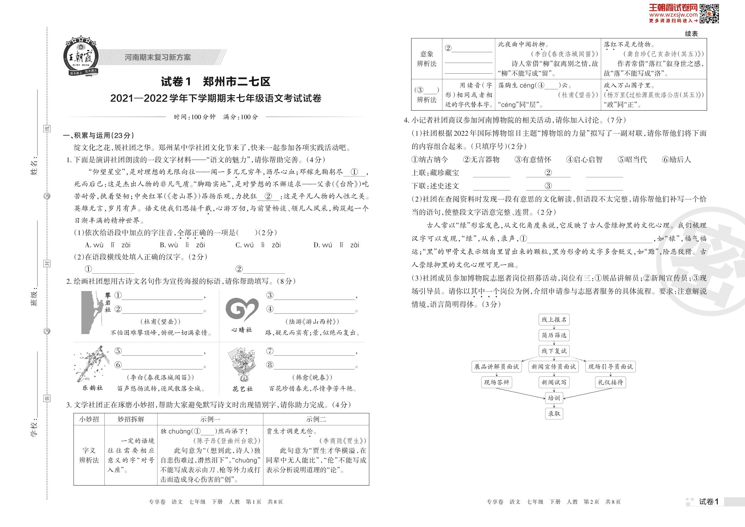 郑州市二七区2021—2022学年下学期期末七年级语文考试试卷(人教版)【1】