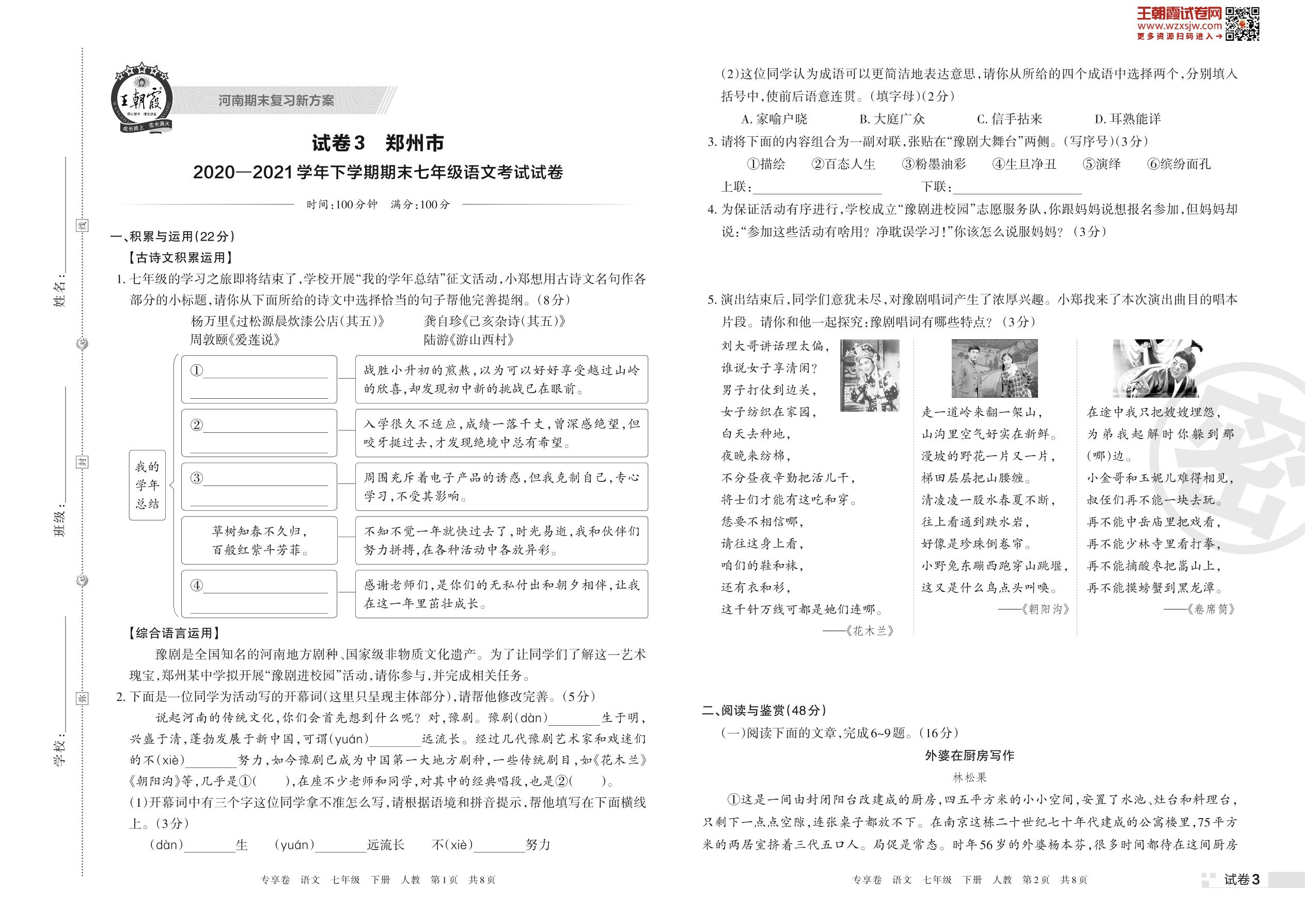 郑州市2020—2021学年下学期期末七年级语文考试试卷(人教版)【3】