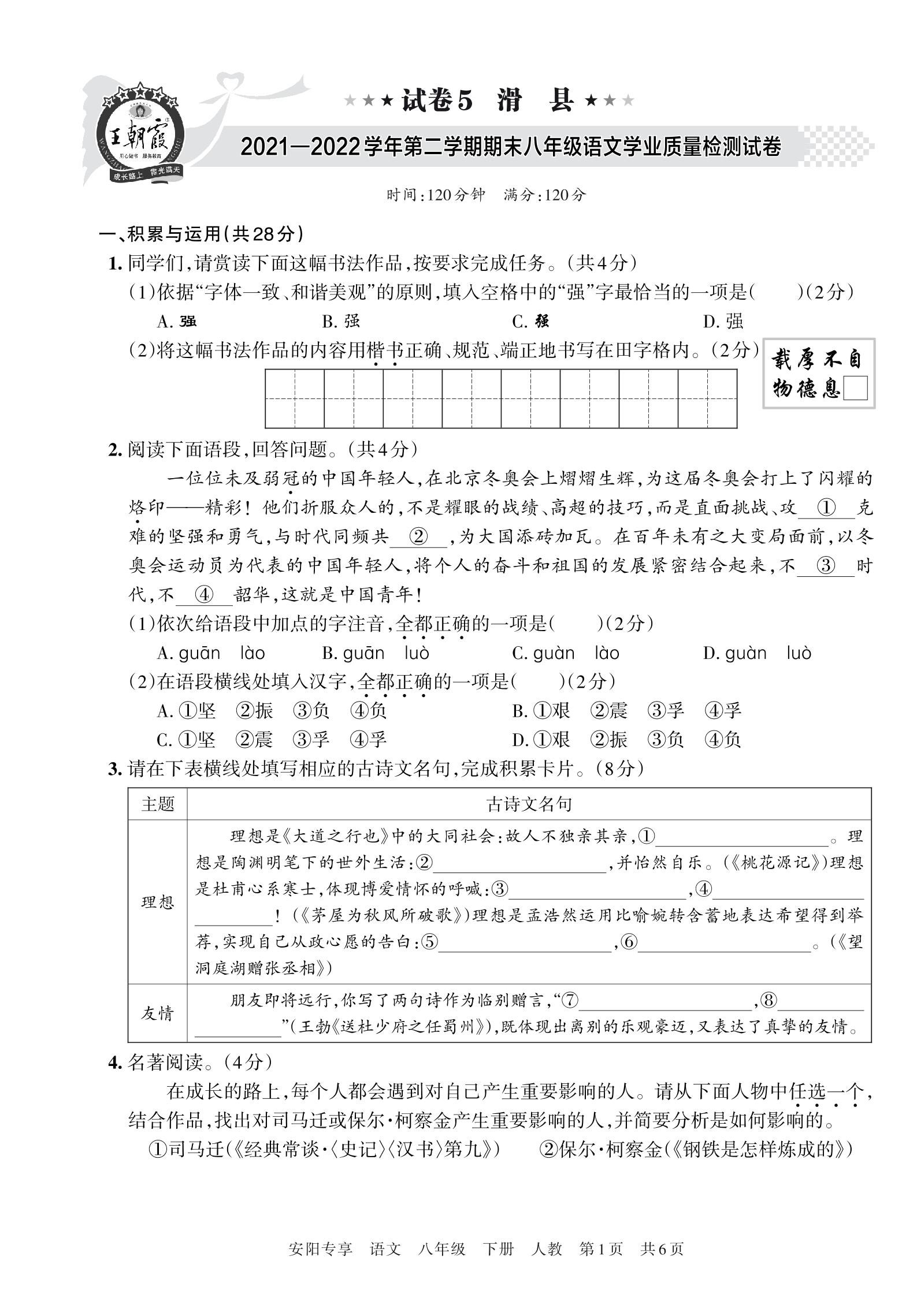 滑县2021—2022学年第二学期期末八年级语文学业质量检测试卷(人教版)【5】