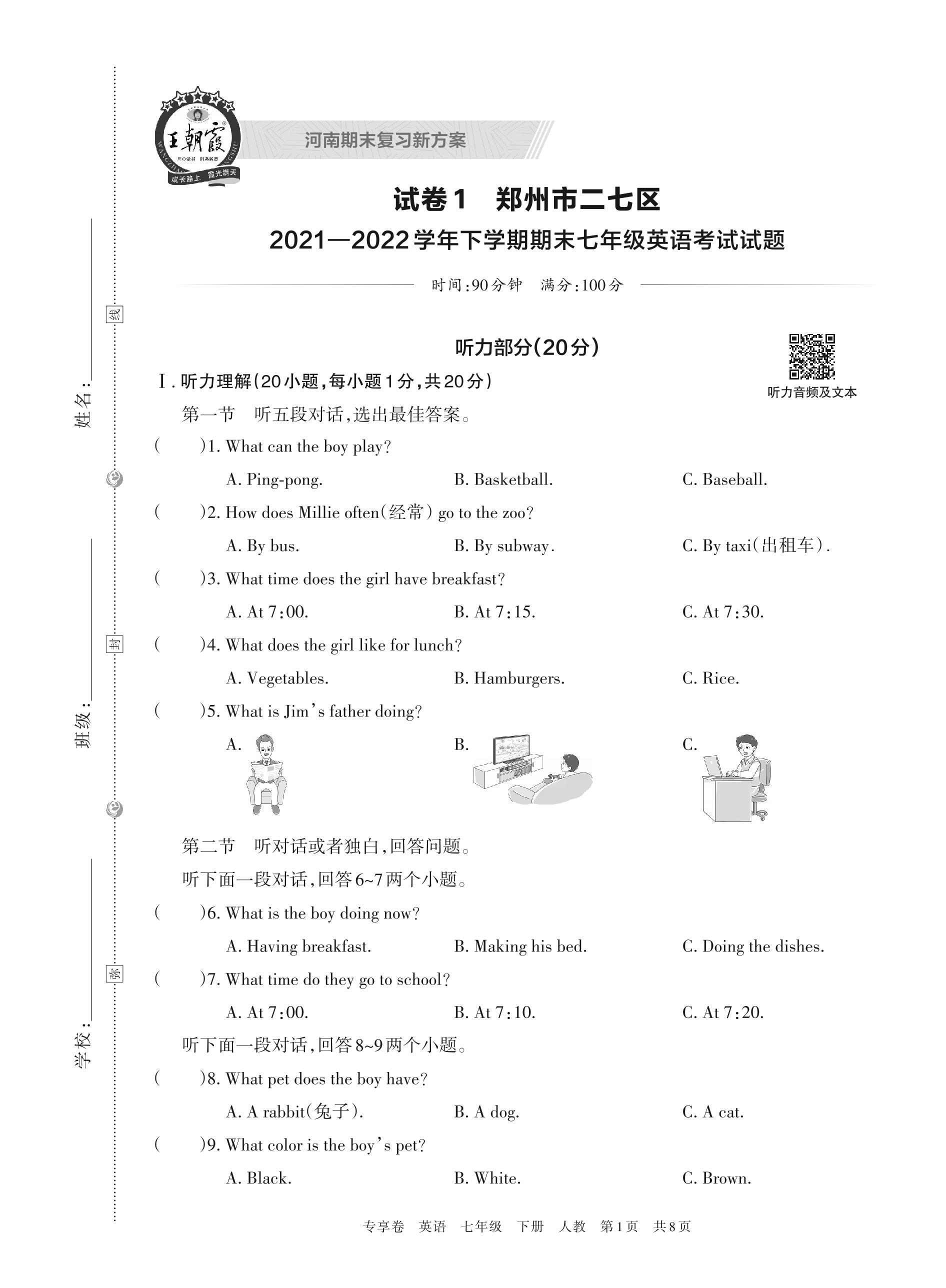 郑州市二七区2021—2022学年下学期期末七年级英语考试试题(人教版)【1】