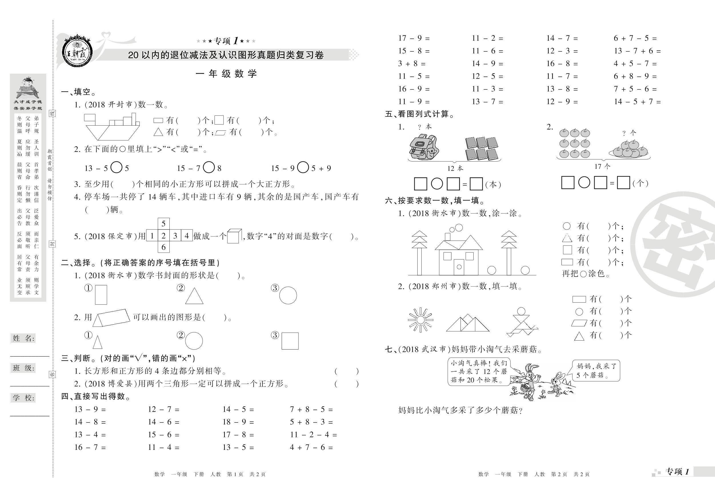 王朝霞期末专项卷——20以内的退位减法及认识图形、分类与整理真题归类复习卷一年级下册数学(人教版)_R210802221759【0】