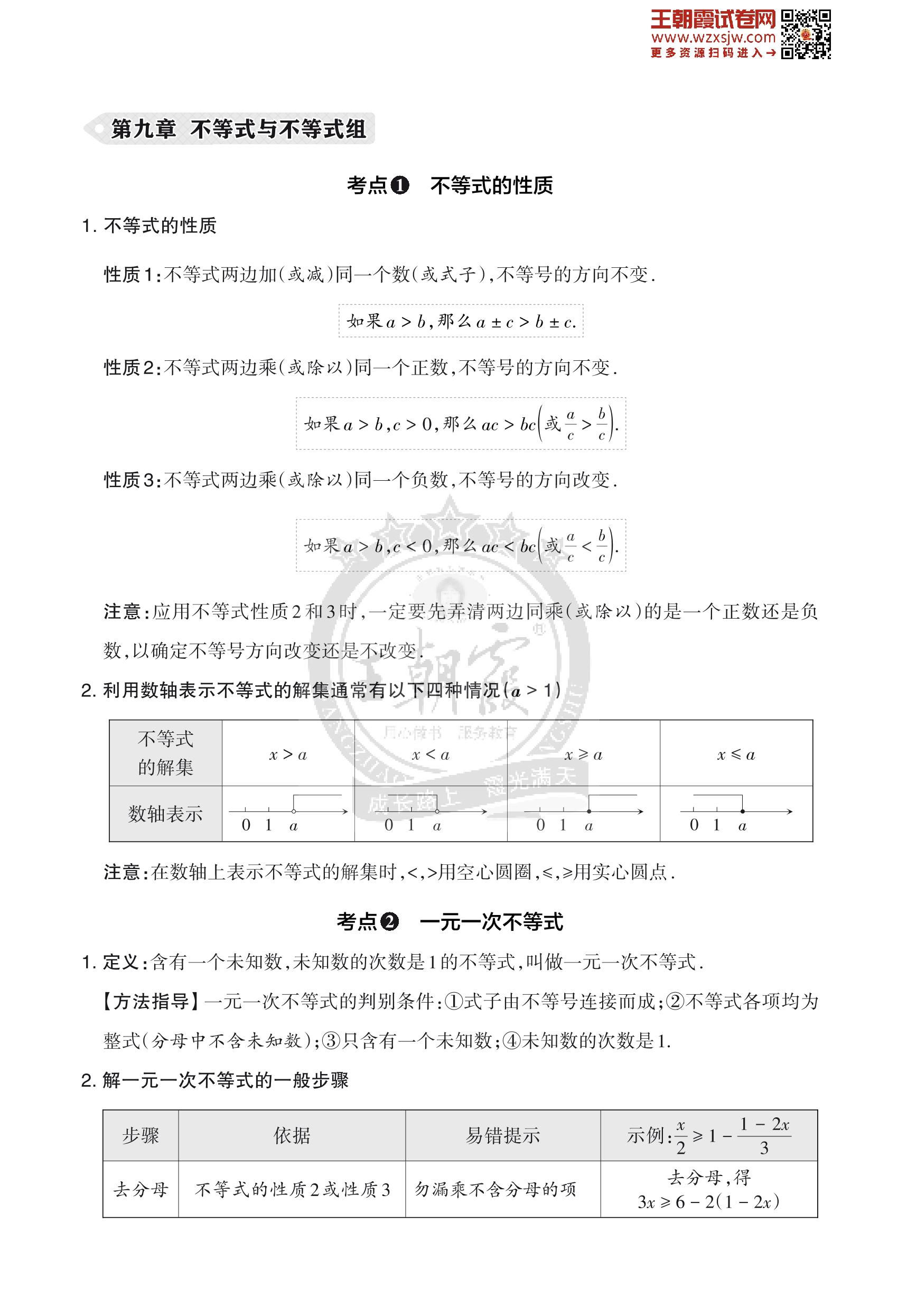 王朝霞期末知识梳理——第九章 不等式与不等式组七年级下册数学(人教版)_R230427151850668