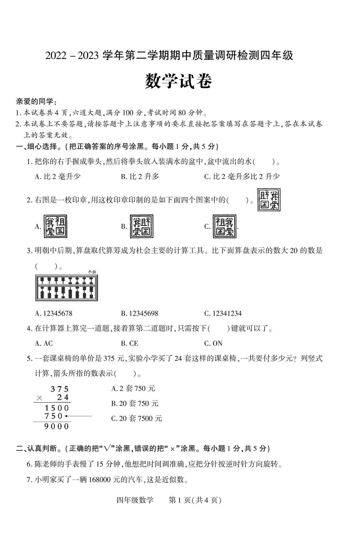 河南省洛阳市伊川县2022-2023学年第二学期期中质量调研检测四年级数学试卷(苏教版)