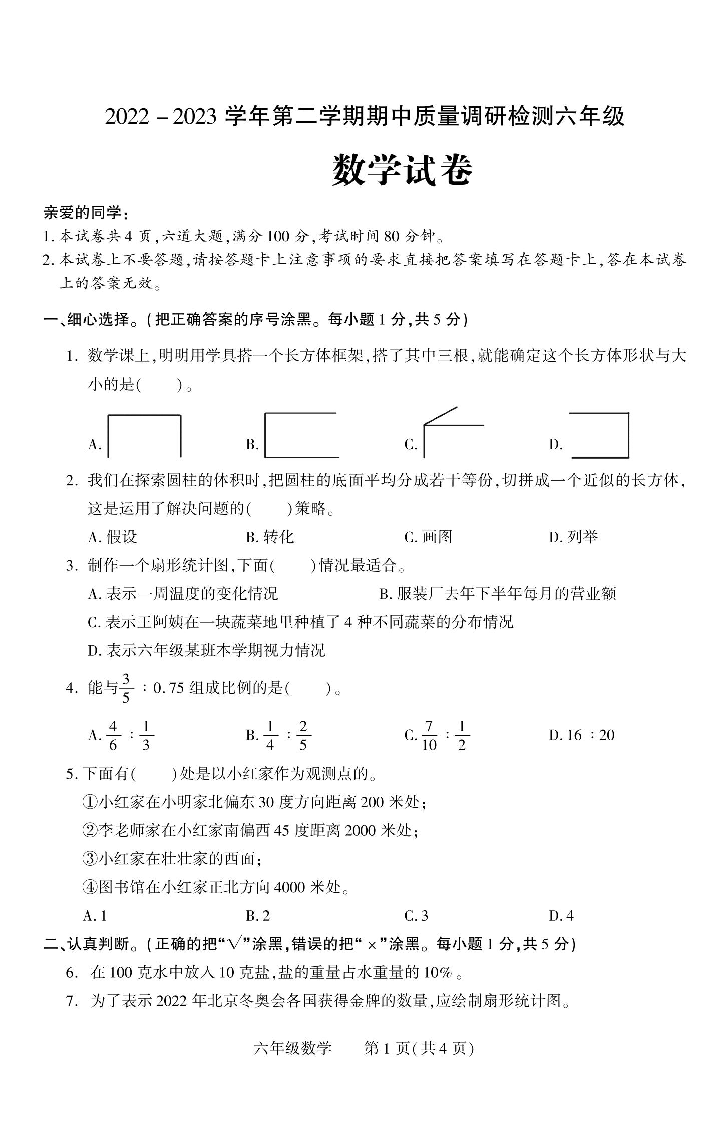 河南省洛阳市伊川县2022-2023学年第二学期期中质量调研检测六年级数学试卷(苏教版)