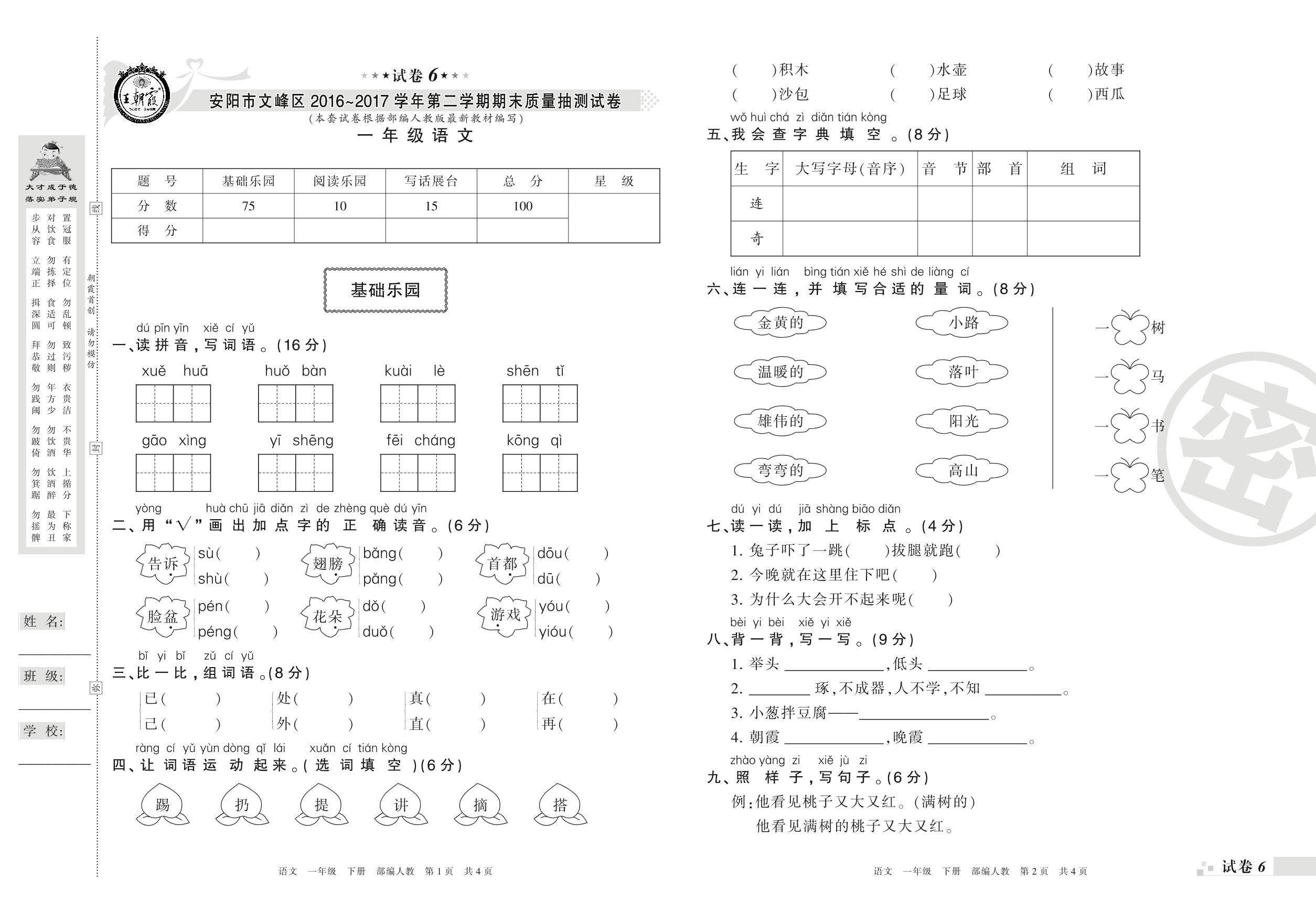 2016-2017学年第二学期安阳市文峰区一年级语文试卷(人教版)【6】