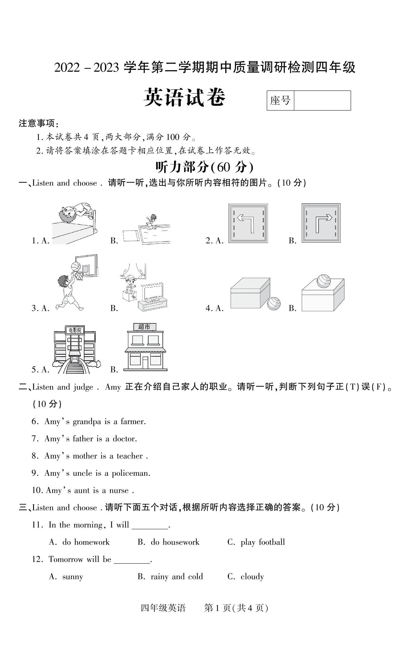河南省洛阳市伊川县2022-2023学年第二学期期中质量调研检测四年级英语试卷(外研版)【无听力音频】
