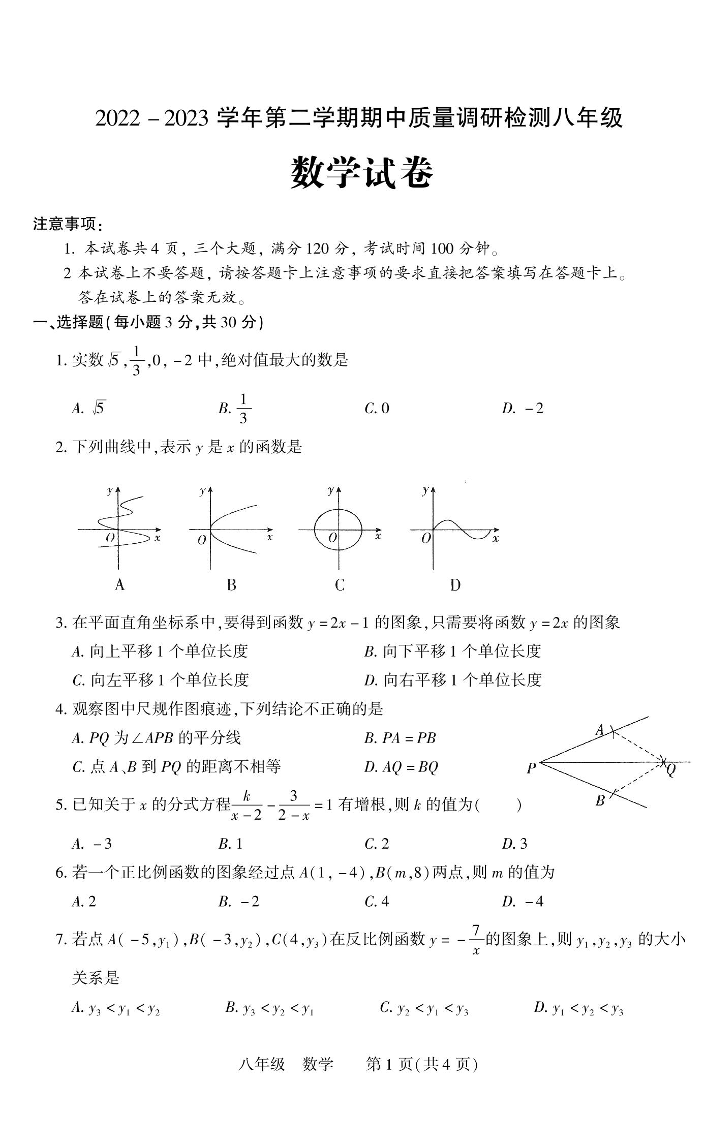 河南省洛阳市伊川县2022-2023学年第二学期期中质量调研检测八年级数学试卷(人教版)