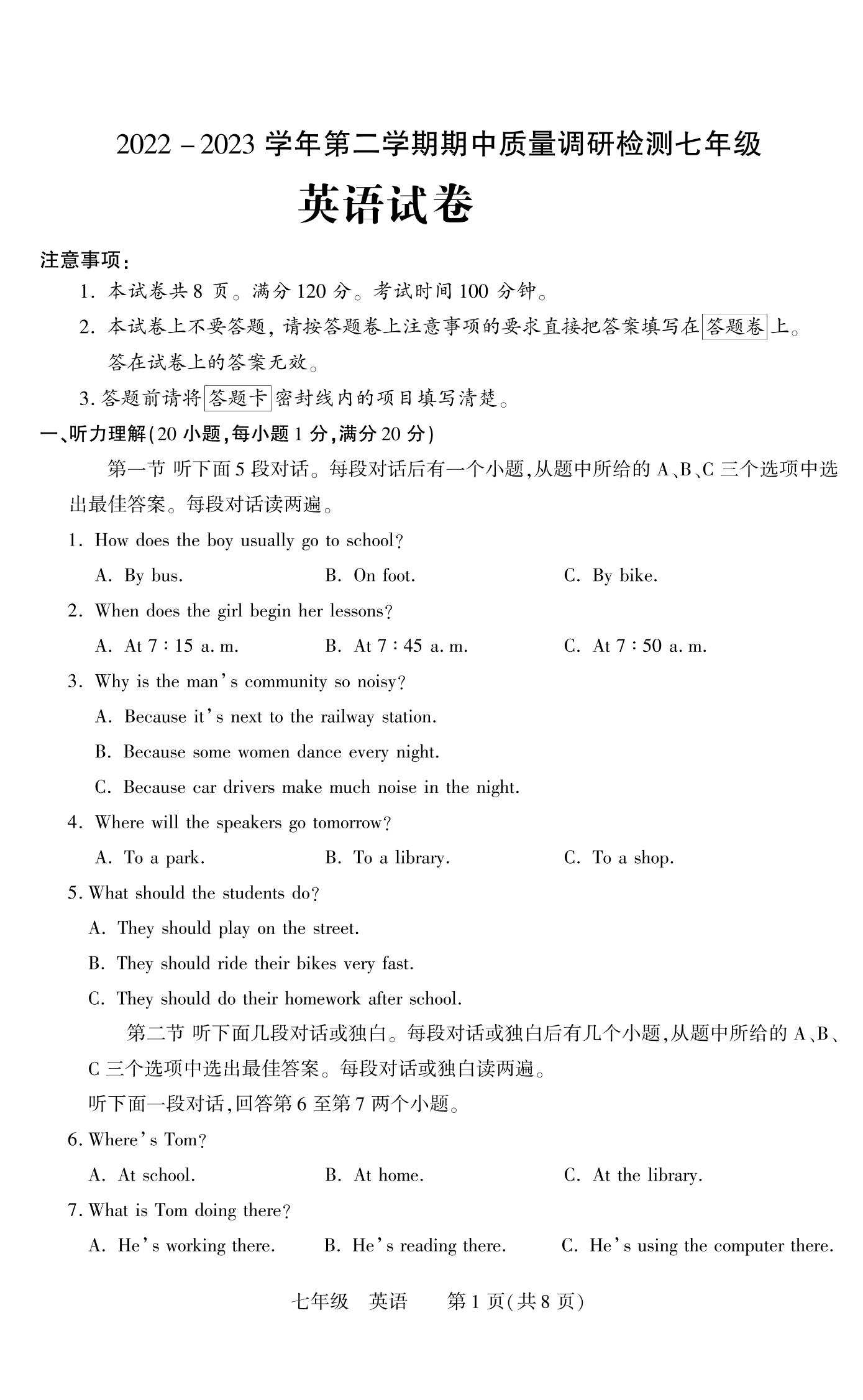 河南省洛阳市伊川县2022-2023学年第二学期期中质量调研检测七年级英语试卷(新课标版)【无听力音频】