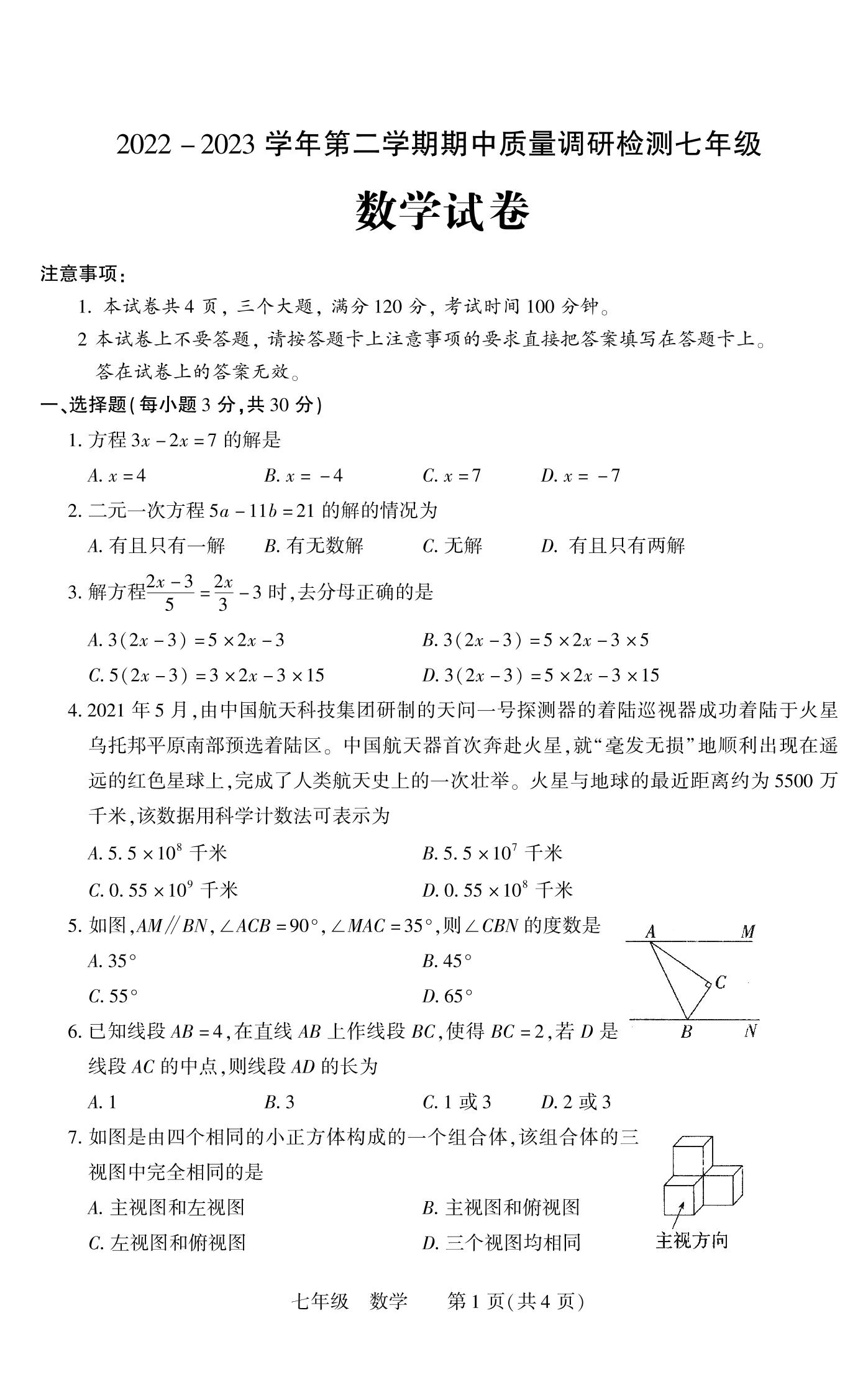 河南省洛阳市伊川县2022-2023学年第二学期期中质量调研检测七年级数学试卷(人教版)