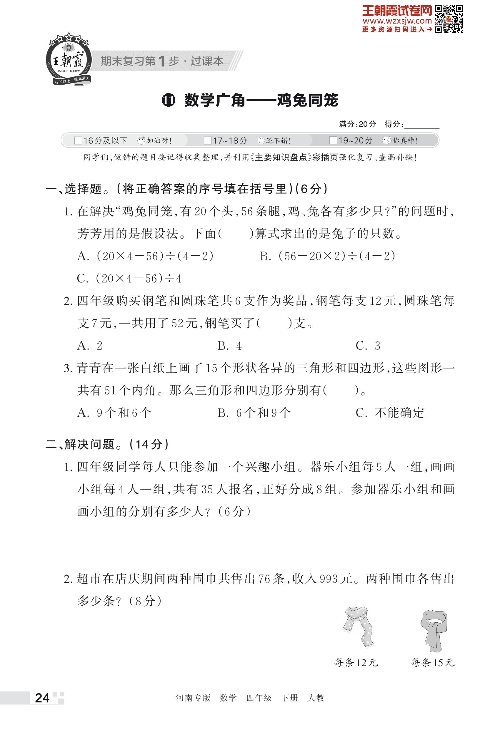 王朝霞期末过课本——11 数学广角:鸡兔同笼四年级下册数学(人教版)