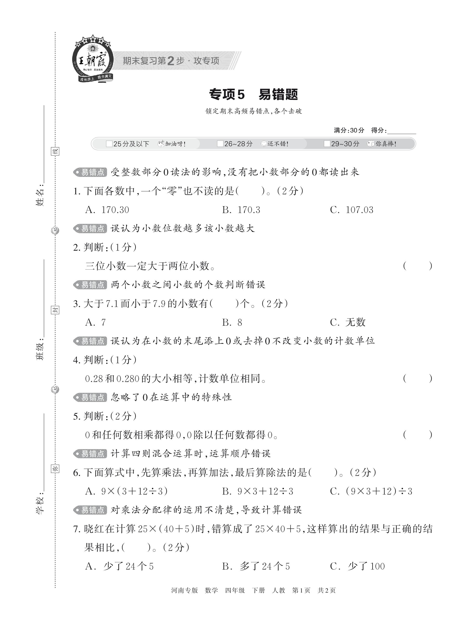王朝霞期末专项卷——易错题四年级下册数学(人教版)_R230428110048781【5】
