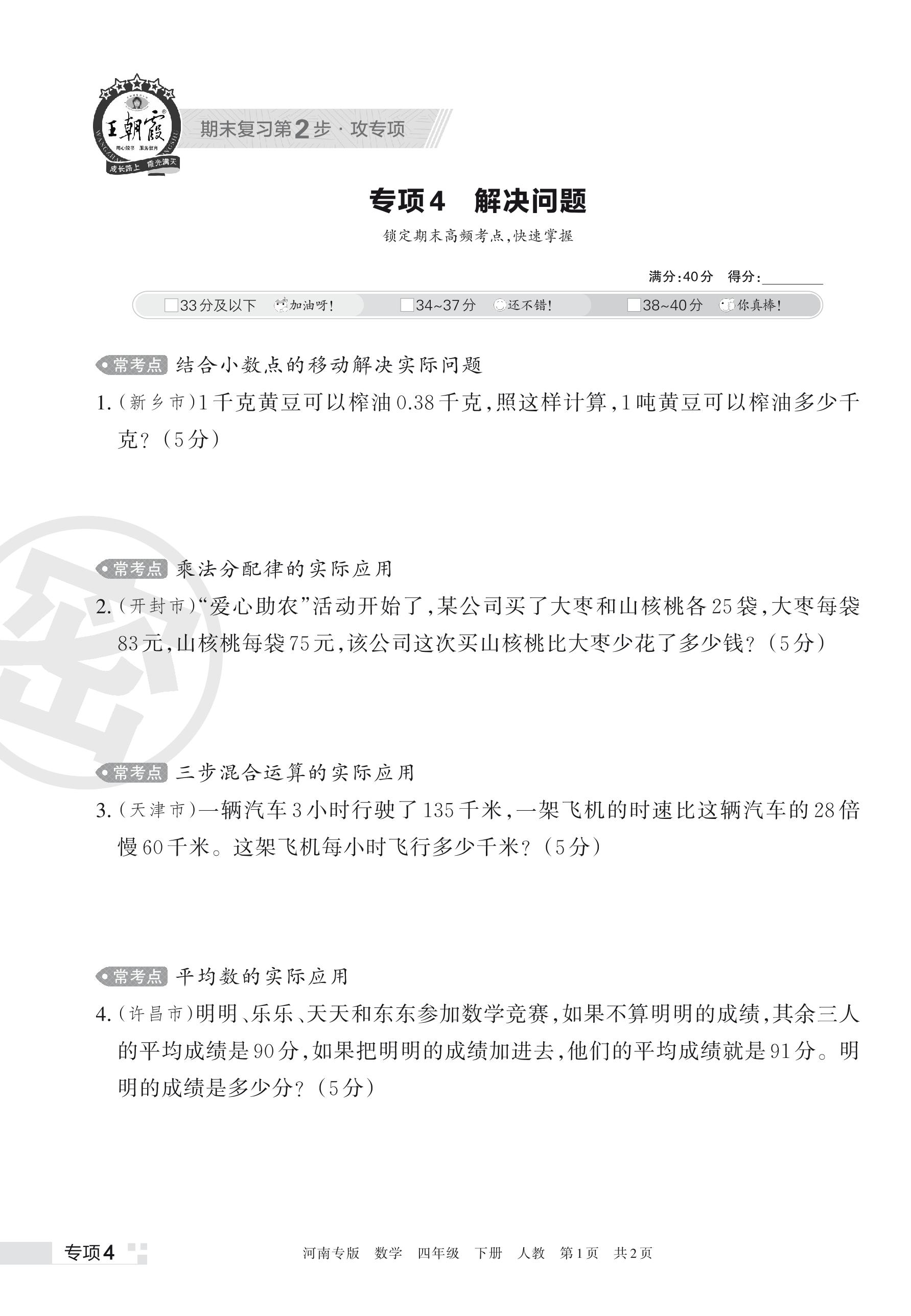 王朝霞期末专项卷——解决问题四年级下册数学(人教版)_R230428110048564【4】