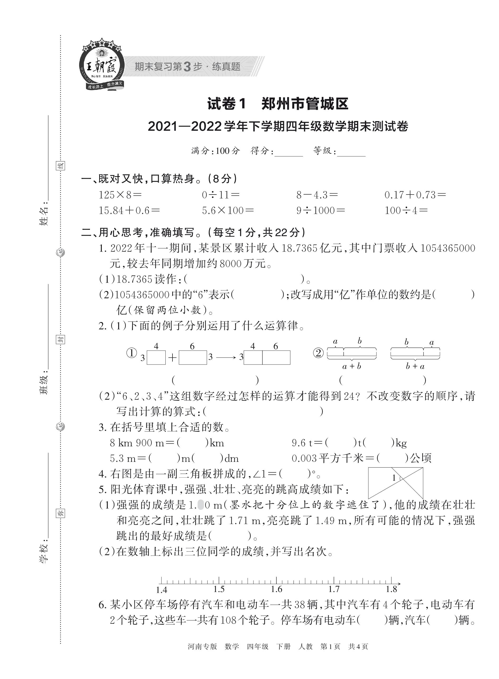郑州市管城区2021—2022学年下学期四年级数学期末测试卷(人教版)【1】